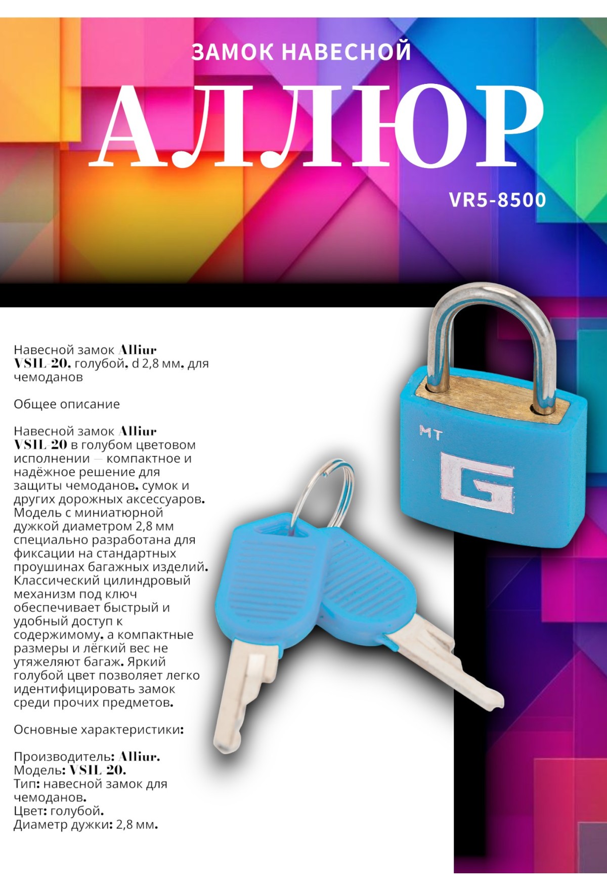 Навесной замок Alliur VS1L‑20 в голубом цветовом исполнении — компактное и надёжное решение для защиты чемоданов, сумок и других дорожных аксессуаров. Модель с миниатюрной дужкой диаметром 2,8 мм специально разработана для фиксации на стандартных проушинах багажных изделий. Классический цилиндровый механизм под ключ обеспечивает быстрый и удобный доступ к содержимому, а компактные размеры и лёгкий вес не утяжеляют багаж. Яркий голубой цвет позволяет легко идентифицировать замок среди прочих предметов.