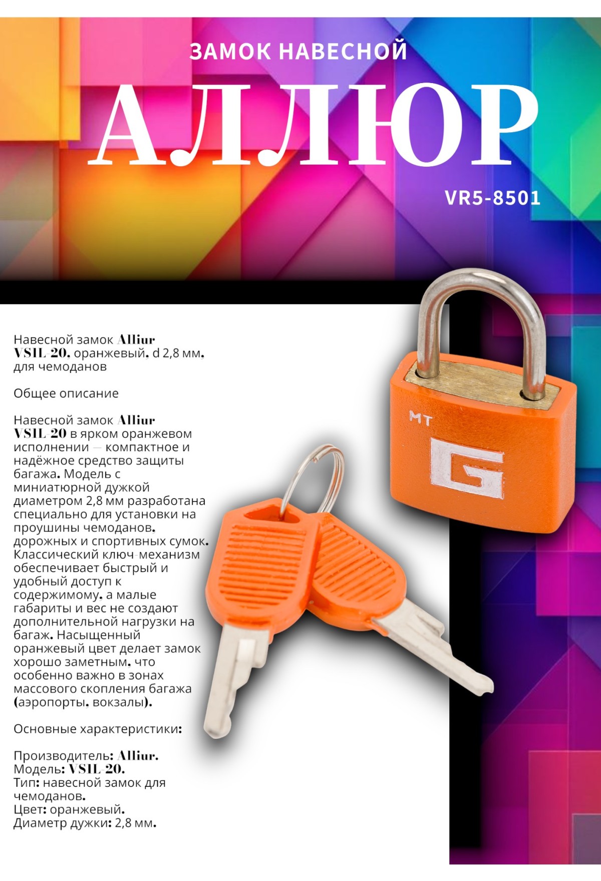 Навесной замок Alliur VS1L‑20 в ярком оранжевом исполнении — компактное и надёжное средство защиты багажа. Модель с миниатюрной дужкой диаметром 2,8 мм разработана специально для установки на проушины чемоданов, дорожных и спортивных сумок. Классический ключ‑механизм обеспечивает быстрый и удобный доступ к содержимому, а малые габариты и вес не создают дополнительной нагрузки на багаж. Насыщенный оранжевый цвет делает замок хорошо заметным, что особенно важно в зонах массового скопления багажа (аэропорты, вокзалы).