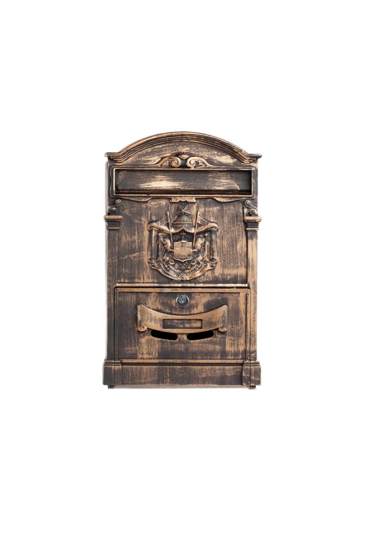 Почтовый ящик №4010В изготовлен из прочного материала, благодаря чему не подвержен механическим повреждениям. Задняя стенка корпуса оснащена замком для монтажа. Предназначен для использования на внешнюю часть забора, двери или квартиры. Цвет старая медь.