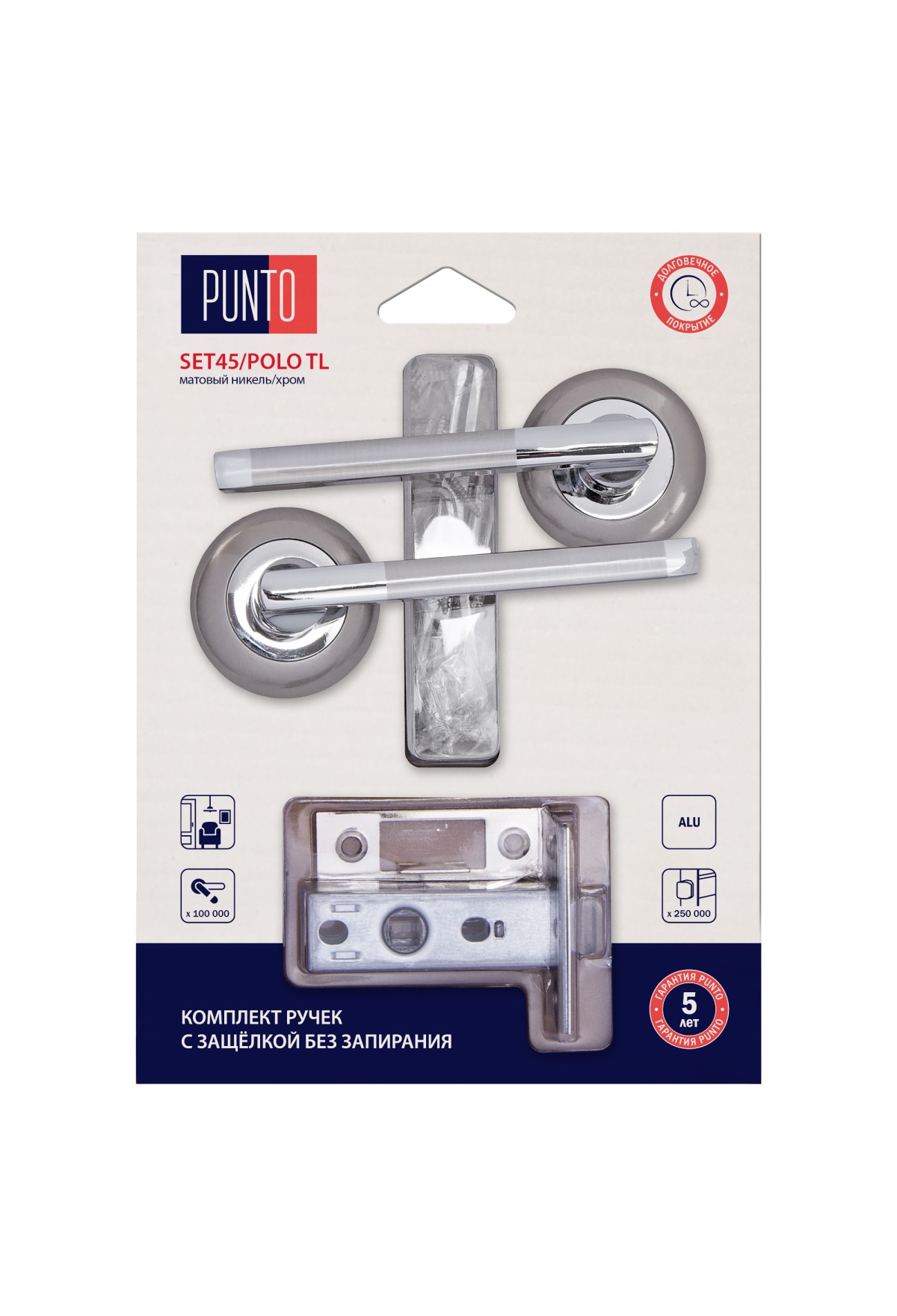 Технические характеристики Комплект ручек Punto (Пунто) с защелкой без запирания LM/A SET45R.TL54.POLO/HD SN/CP-3 матовый никель/хром