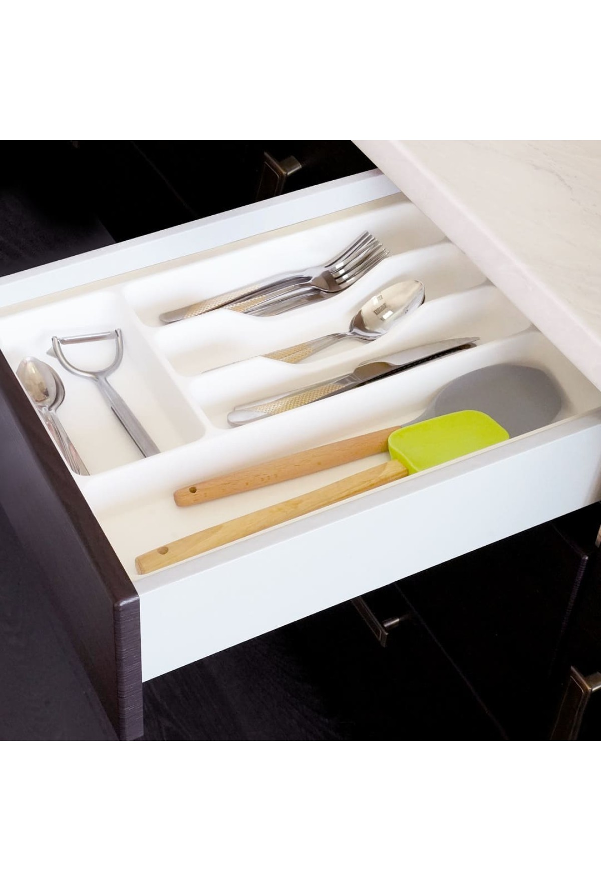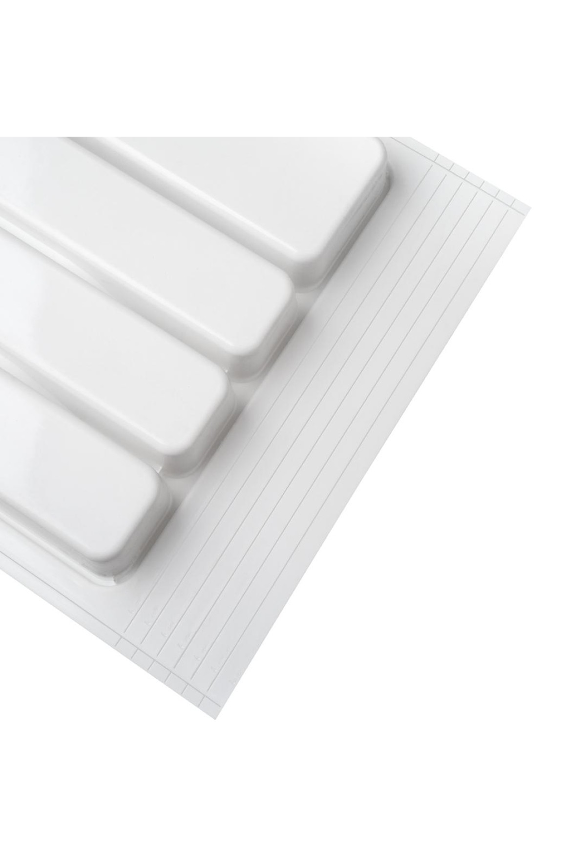 Универсальный обрезной лоток для столовых приборов в ящик корпуса 400мм. Насечки с трех сторон: по глубине разметка 310, 325мм, по ширине 424, 434,444, 454,464, 474, 485мм. Выполнены из ударопрочного экологичного полипропилена. Не имеют запаха. Выпускаются на собственном производстве. Каждое изделие имеет маркировку партии для контроля качества. Оптимальное решение для организации пространства в ящике. Стильные ипродуманные емкости для столовых приборов с матовой бархатистой поверхностью, кроме приятных тактильных ощущений, гарантируют отличные эксплуатационные характеристики и снижение уровня шума. С обратной стороны поверхности нанесена линия реза по типовым размерам ящика. Изделия не требует специального ухода их достаточно протирать влажной тряпкой, губкой или легко вымыть водой.