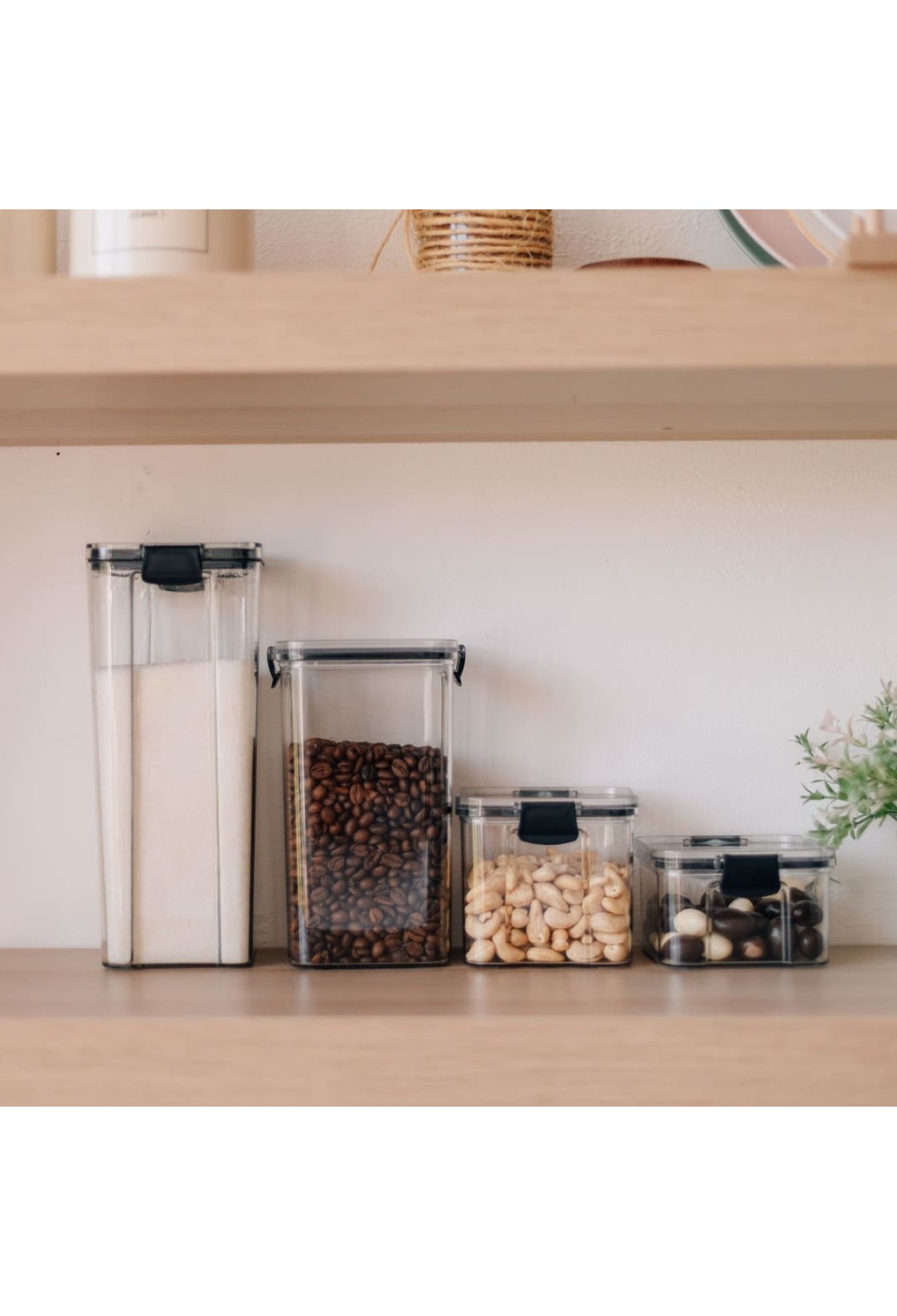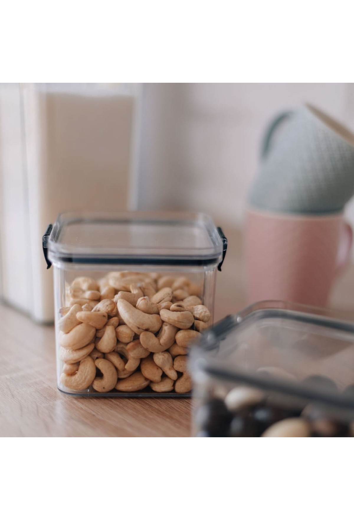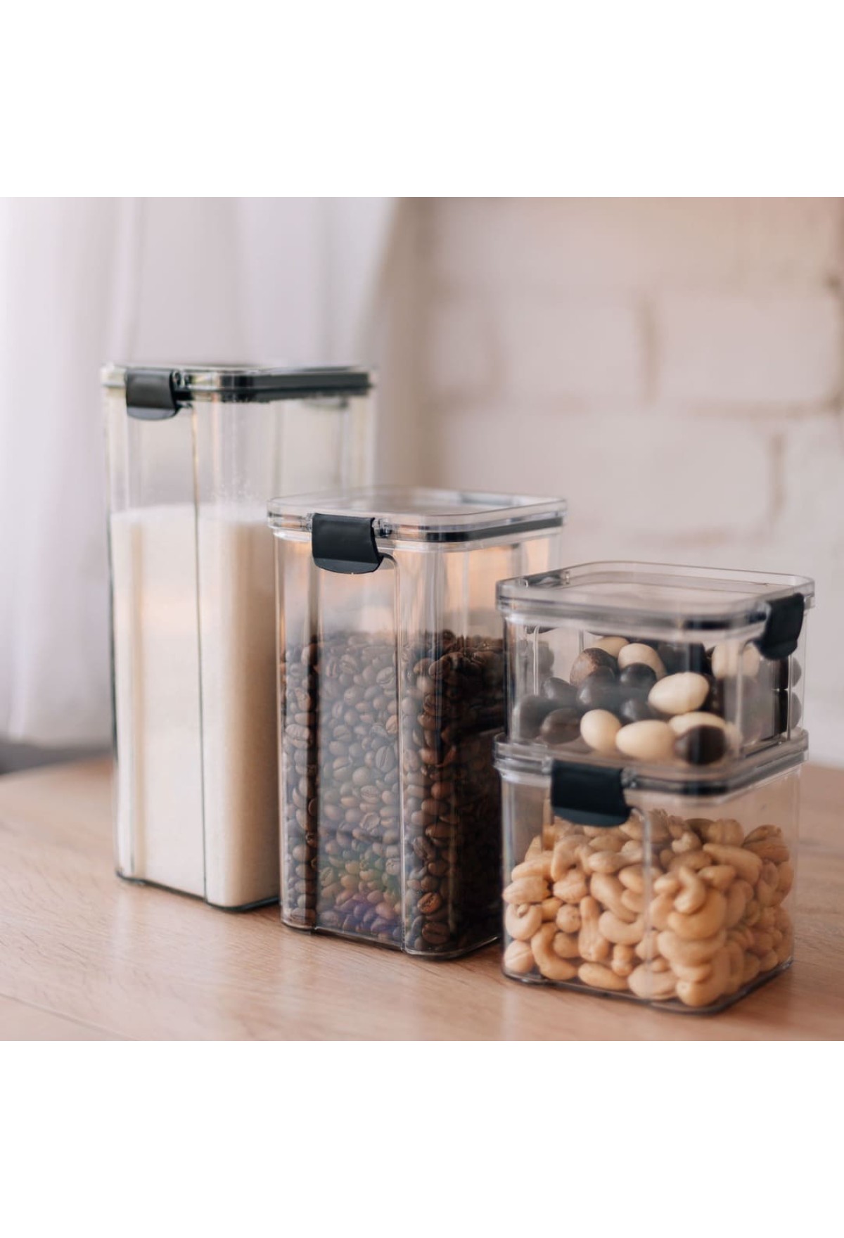 Благодаря силиконовому уплотнительному кольцу и двум фиксаторам пластиковая крышка плотно прилегает к самому контейнеру, что позволяет надёжно хранить сахар, соль, муку, зёрна кофе, сладости, ягоды и другие продукты.