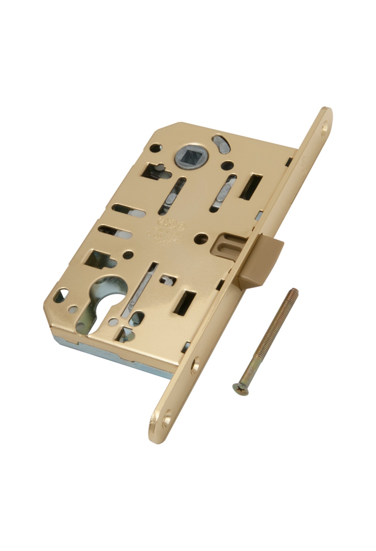 B01103.50.03 Замок межкомнатный под цилиндр в цвете латунь с пластиковым язычком серии MEDIANA EVOLUTION отличается бесшумностью при закрывании. Защелка разработанна инженерами компании AGB и объединяет в себе надежность, качество используемых материалов, точность механических соединений и инновации. Все замки серии Evolution имеют один размер и взаимозаменяемы между собой.