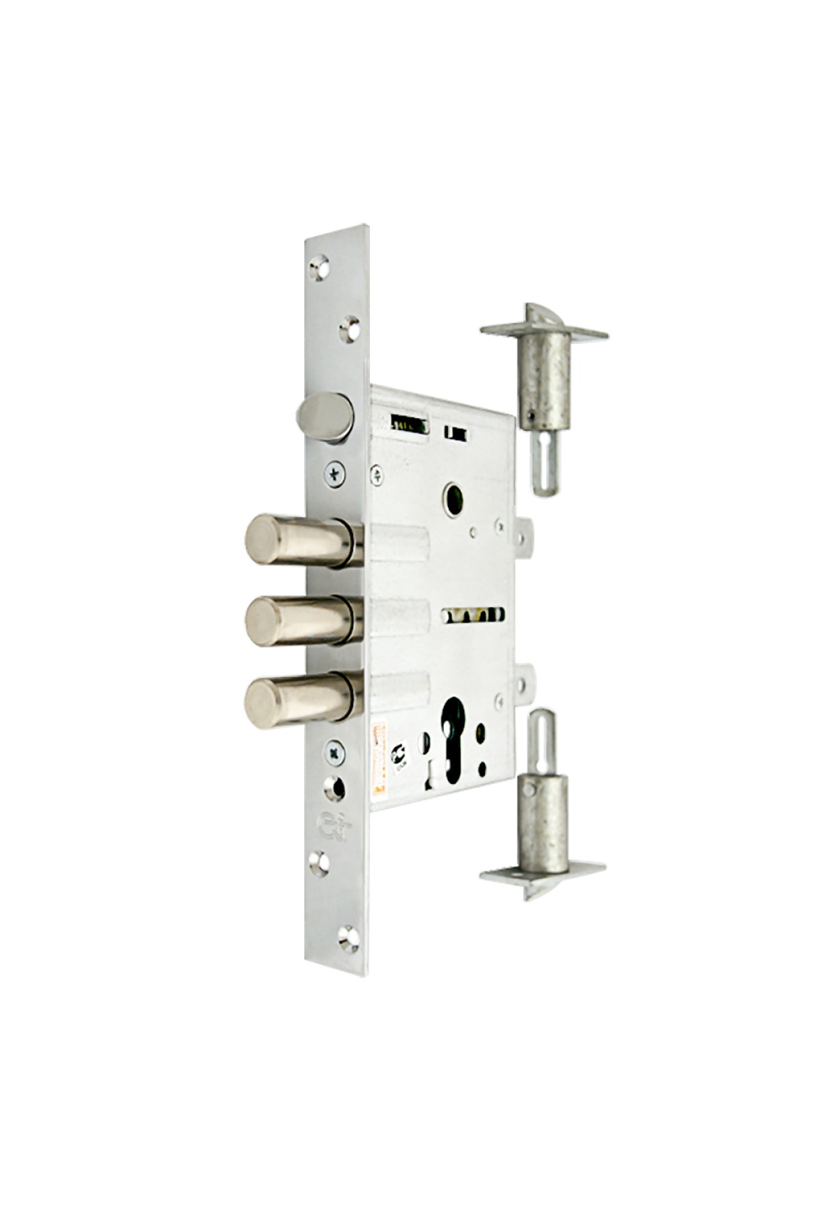Корпус замка ЗВ-7РМП-006-Хп предназначен для установки в противопожарные двери. Корпус замка снабжен засовом, состоящим из 3-х ригелей диаметром 16,8 мм, защелкой, переворачиваемой под любое исполнение и двумя дополнительными защелками. Дополнительные защелки устанавливаются в верхнем и нижнем углах двери в целях предотвращения температурной деформации дверного полотна и, как следствие, проникновения огня. Защелки через тяги соединяются с ригелями, которые сходятся при повороте ручки. Все детали стальные. Замки сертифицированы по 4-му классу при использовании стандартного цилиндрового механизма секретности "KALE"с ключами "перфокарта"и броненакладкой. Вылет засова 36 мм при 3-х полных оборотах ключа. Угол поворота ручки привода защелок через шток квадратного сечения 8x8 мм составляет 32 градуса. Цвет: полировочный хром.