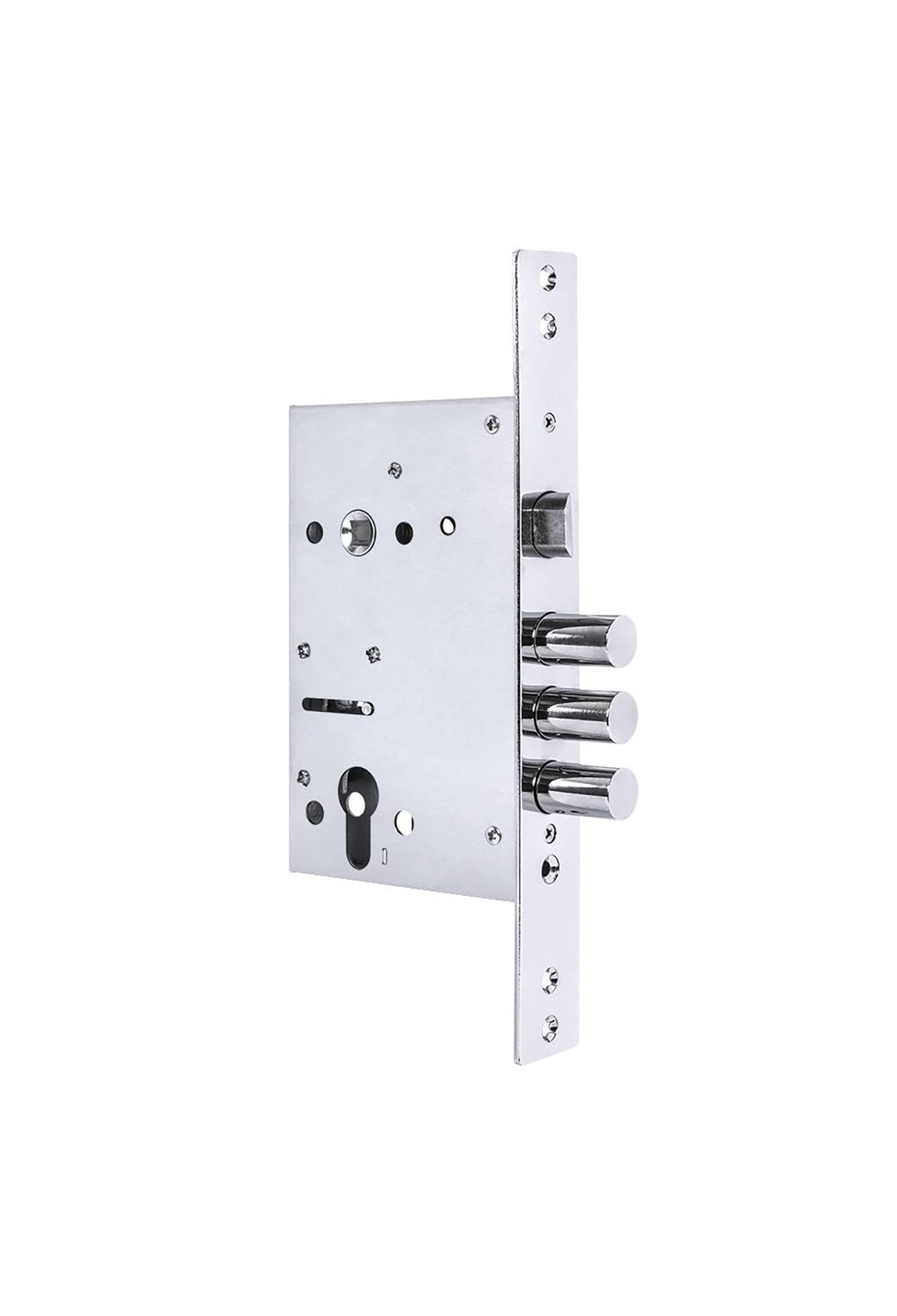 Корпус врезного цилиндрового замка PUNTO с тремя ригелями и защелкой предназначен для установки во входные металлические двери. Стальной оцинкованный корпус. Универсальная реверсивная защелка, подходит для левых и правых дверей. Отверстия под стяжные винты. Бэксет- 65мм. Выход ригелей- 26мм. Межосевое расстояние -85 мм. Диаметр ригелей -16мм. В комплект входит крепежная фурнитура.