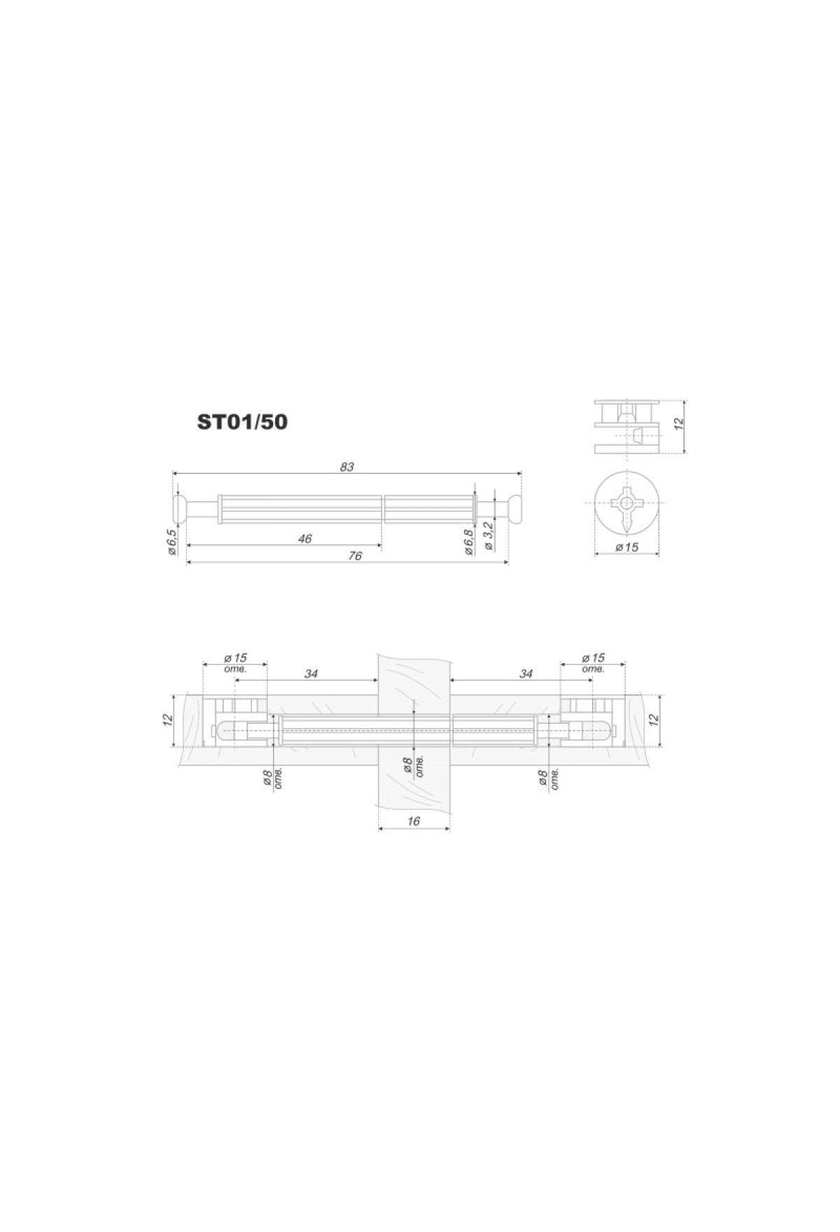 ST01/50 – двухсторонняя эксцентриковая стяжка для ровной установки полок с двух сторон. В комплекте 2 эксцентрика диаметром 15 мм и высотой 12 мм и один дюбель. Предназначены для плит толщиной от 16 мм.