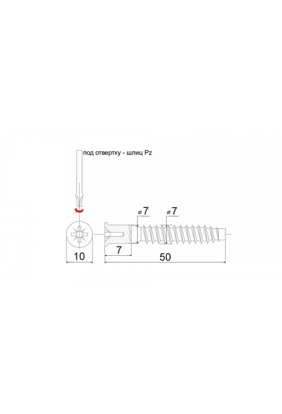 ST08/05 — винт-стяжка (конфирмат) 7*50 с универсальным отверстием для короткой и длинной заглушки, с резьбой под отвертку – шлиц Pz. Используется для сборки корпусной мебели из ДСП, ЛДСП, дерева и конструкций из многослойной фанеры.