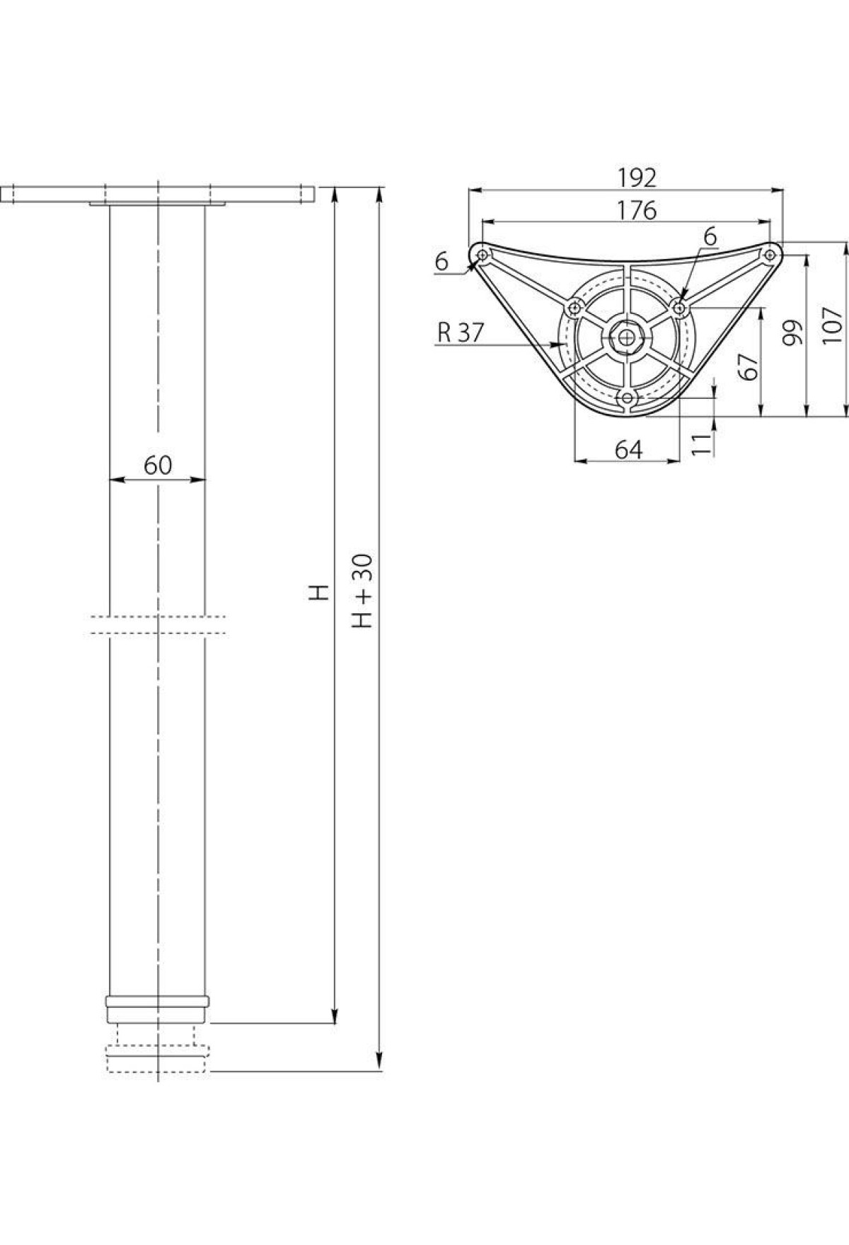 Технические характеристики опора-нога 60*820мм, крепление боковое, регулируемая, хром