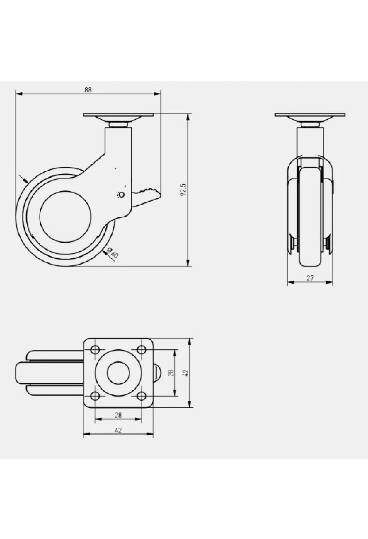 Колесо мебельное STRADA, d-60мм, черное, со стопором - опора для передвижных мебельных конструкций. Крепится к мебели посредством металлической пластины (площадки) 42x42 мм.