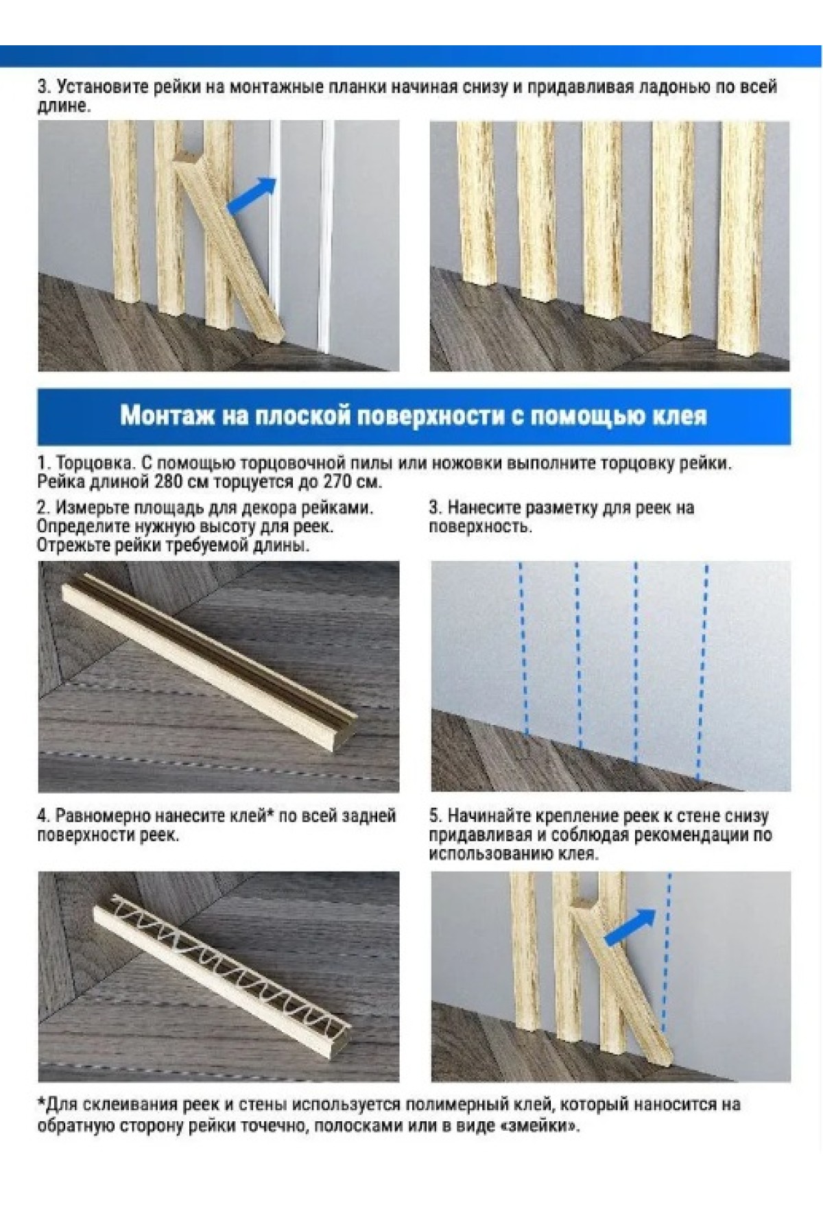 Имея небольшой вес, рейки легко фиксируются на стене, нише или потолке при помощи клея или шурупов.