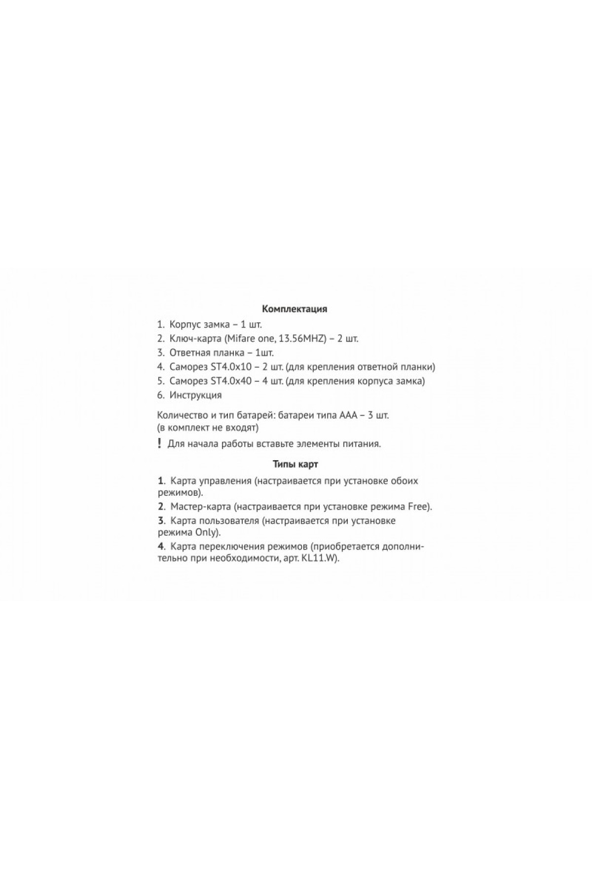 Замок открывается с помощью специальной ключ-карты KL01 (идёт в комплекте). Устройство оснащено двумя режимами работы: FREE и ONLY (установлен по умолчанию), которые можно переключать с помощью мастер карты KL11.W (приобретается отдельно).