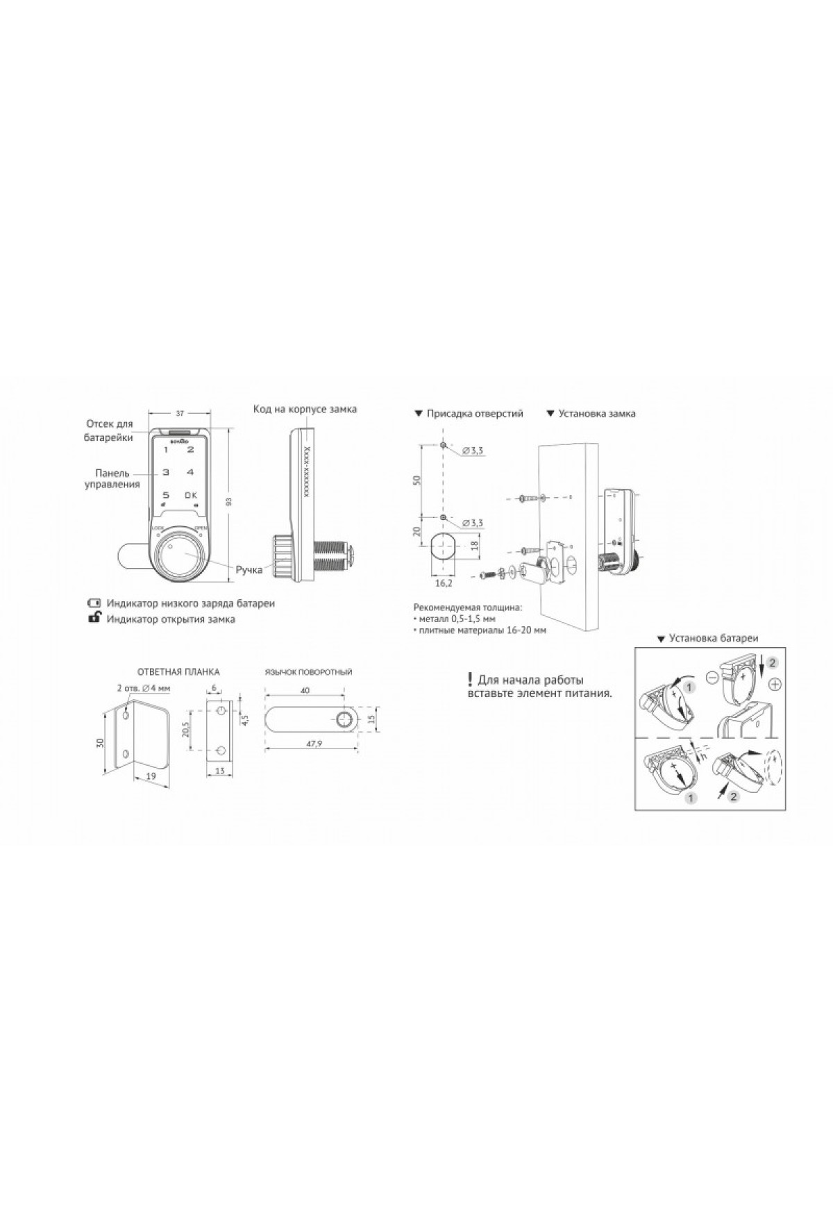 CODEX Z603 — электронный кодовый замок с сенсорными кнопками для установки с лицевой части фасада. Совместим с мебелью из плитных материалов (толщиной от 16 до 20 мм), а также с металлическими фасадами (толщиной от 0,5 до 1,5 мм). Замок состоит из сенсорной клавиатуры на лицевой части фасада, а также поворотного механизма с обратной стороны фасада, который открывает / блокирует его в зависимости от набранного кода. Для установки замка потребуется просверлить сквозное отверстие в фасаде.Поворотный механизм с лицевой стороны фасада может быть использован в качестве ручки. Замок оснащён двумя режимами работы: FREE и ONLY (установлен по умолчанию), которые можно переключать с помощью специального пароля управления (информация в инструкции).