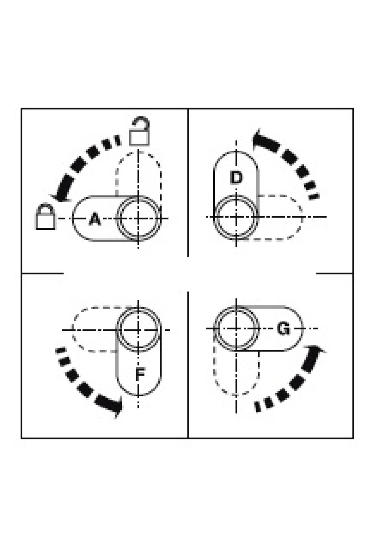 Направление закрывания: А - возможна перестановка запорного рычага на варианты закрывания D, F, G.