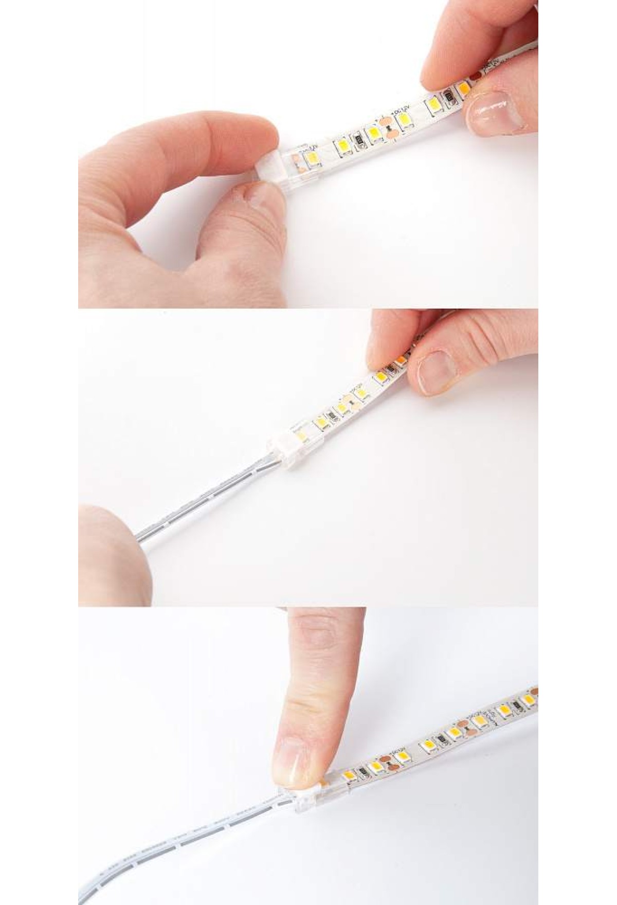 Коннектор для беспаечного подсоединения кабеля питания к светодиодной ленте. Просто вставьте в соответствующие пазы коннектора LED-ленту и концы кабеля, обязательно соблюдая полярность. Нажмите на фиксатор сверху. Лента и кабель будут надежно соединены между собой.