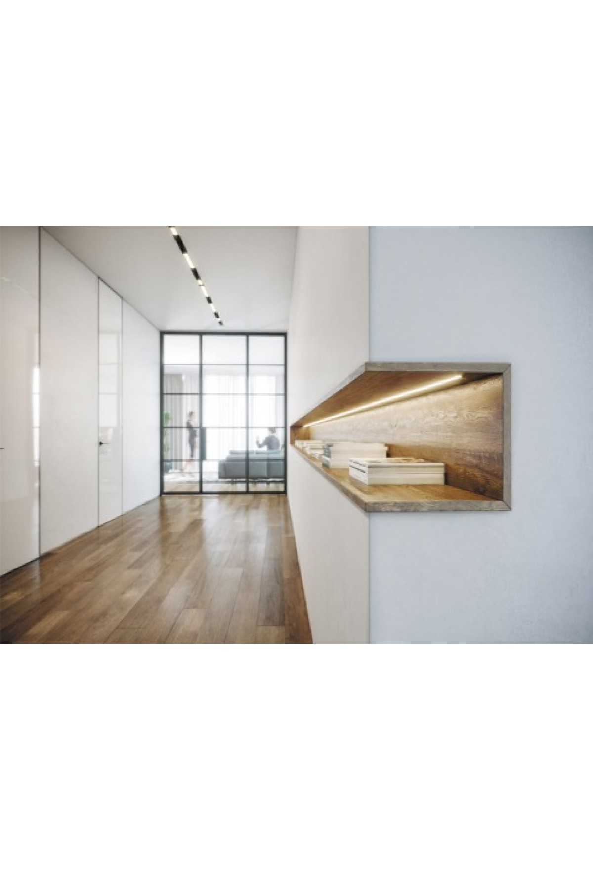 Врезной узкий профиль-рассеиватель закрытого сечения производится в Италии. Благодаря особым оптическим свойствам рассеивает мягко и равномерно. Не требует алюминиевого профиля для установки. Используя профиль, Вы можете самостоятельно скомплектовать светильник нужной длины. Для этого выберите светодиодную ленту Alumove Light 5 или 6 мм шириной — в комплект ленты входит гибкая пластина. Для монтажа светильника потребуется фрезеровка шириной 9,2 мм, глубиной 11 мм — паз закроется корпусом светильника заподлицо. Подберите выключатель для управления светильниками и трансформатор для подключения к сети питания.