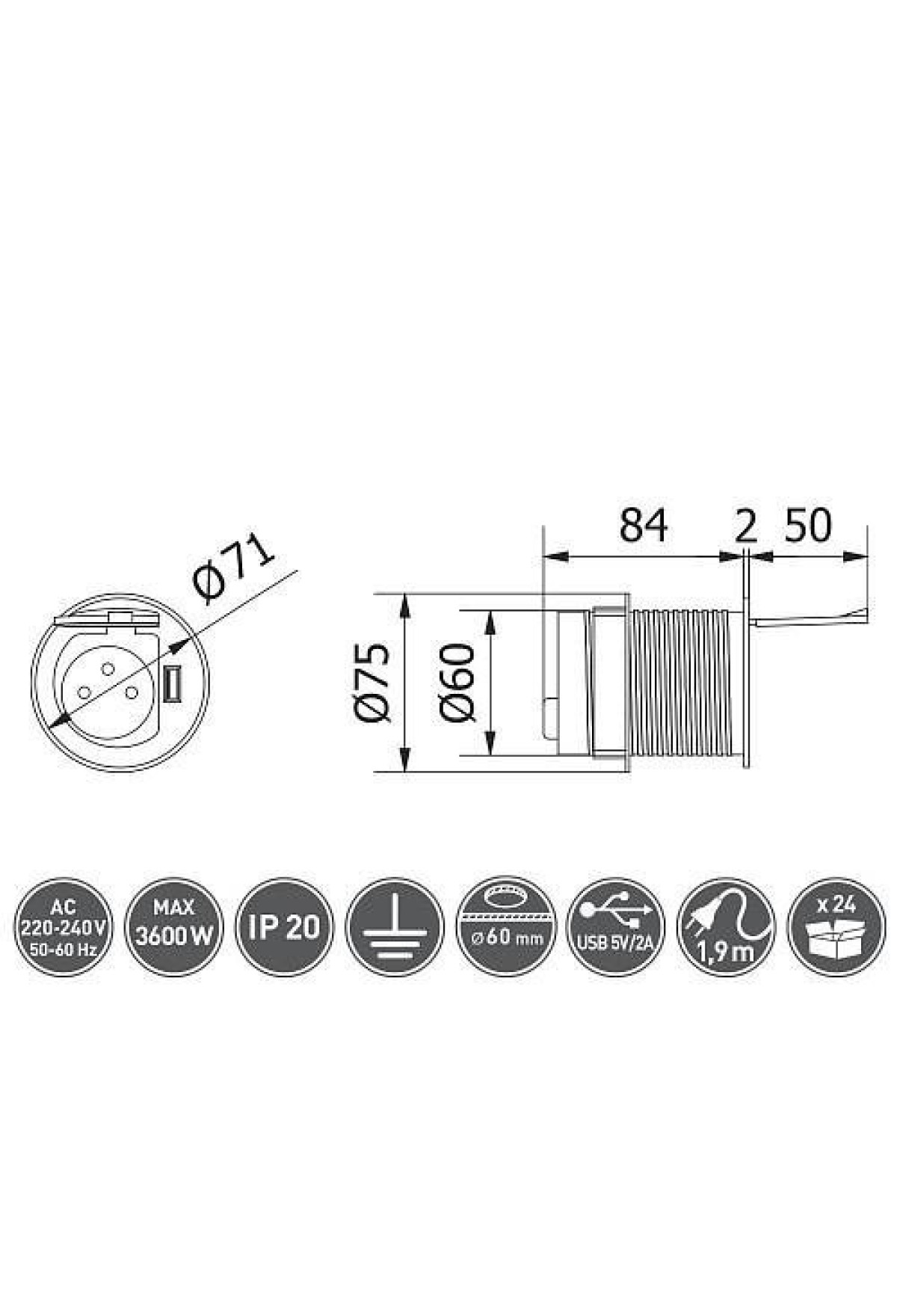 Технические характеристики Удлинитель встраиваемый цилиндрический CHARGER MINI 60мм на 1 розетка алюминий AE-BPW1S1UCH-53 GTV