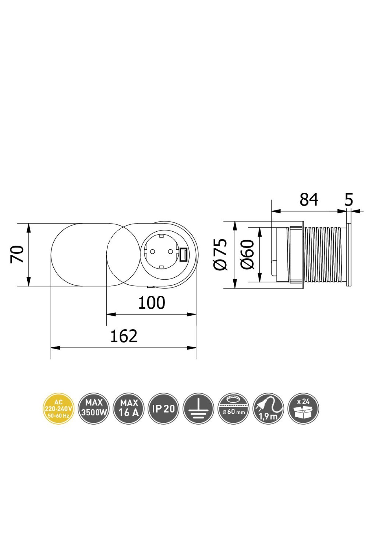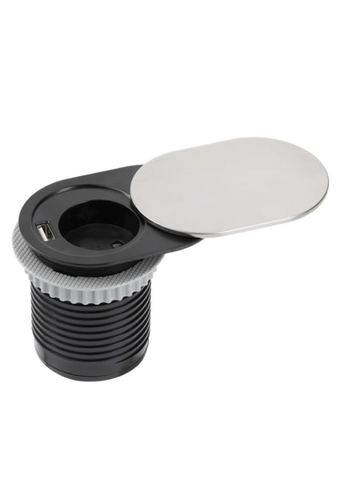 В пассивном состоянии удлинитель полностью скрыт под столом. Когда возникает необходимость подключить гаджет к сети, вы легко смещаете овальную крышку в сторону и получаете доступ к розетке и USB-порту.