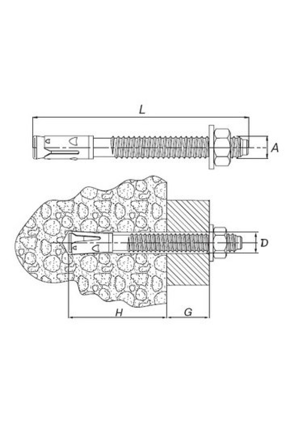 Это стержень (шпилька) с метрической резьбой у основания, и конусом с распорной манжетой с другой. Также в комплекте идет гайка и шайба.