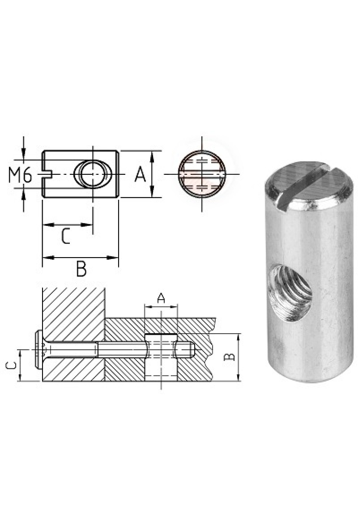 Технические характеристики муфта-бочонок М6*10*12,5мм прямой шлиц, цинк/2000