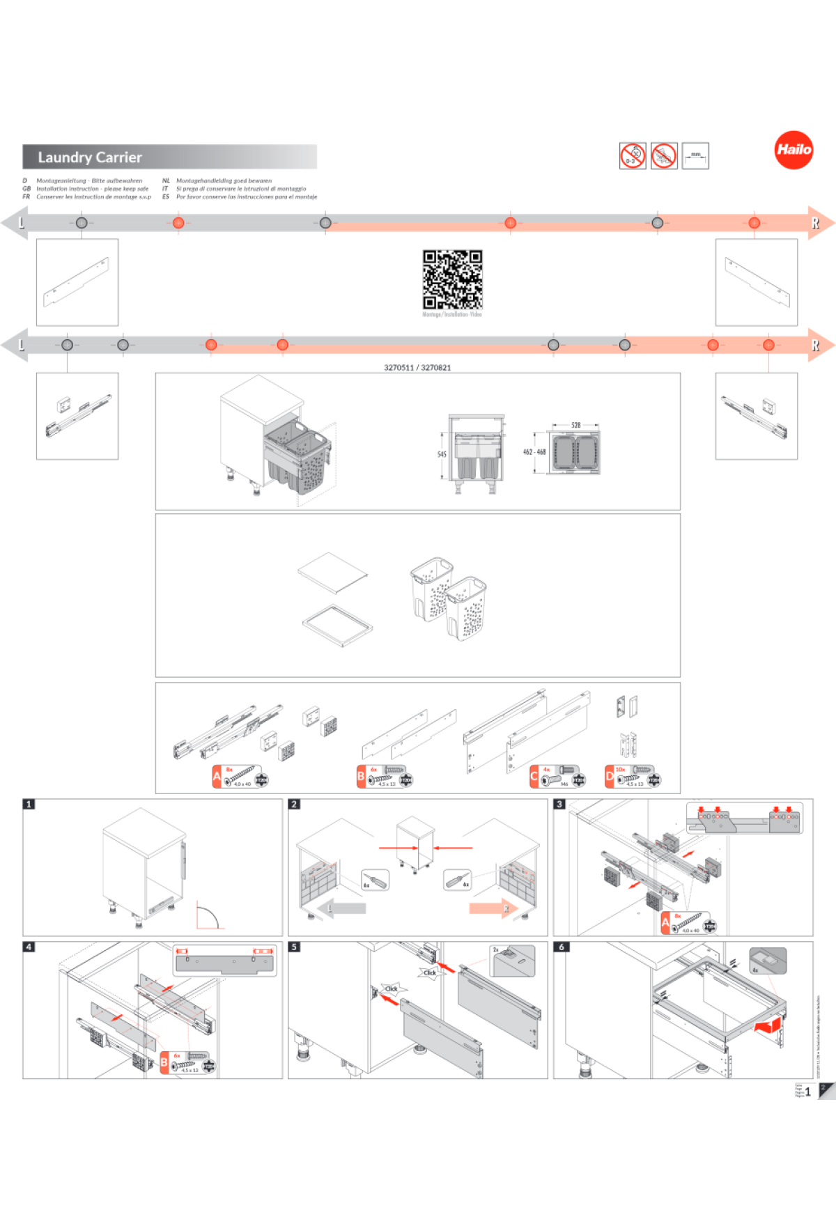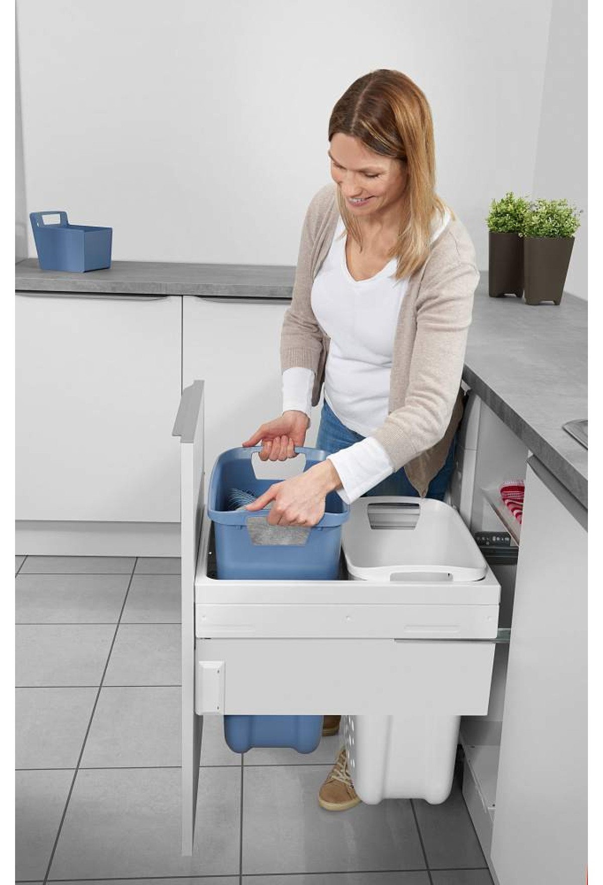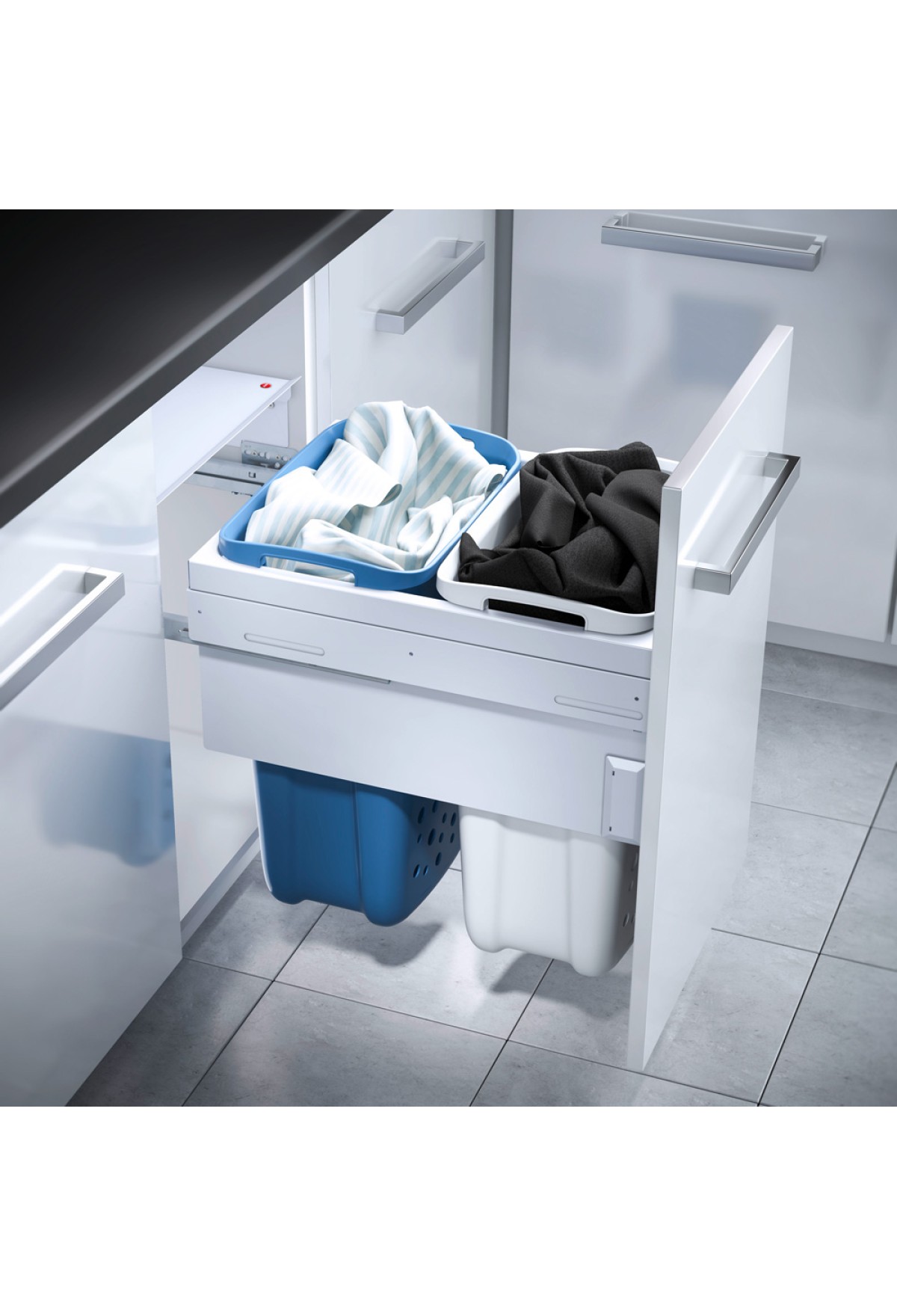 Система для хранения белья для установки в шкафы с внутренней глубиной не менее 530мм. Подходит для стандартных кухонных шкафов. Логичное оснащение шкафа рядом со стиральной машиной. Корзины с перфорациями для свободной циркуляции воздуха. Направляющие с панелями, препятствующими попаданию мусора в механизм и защемлению белья. Полное выдвижение для комфортного доступа. Мягкое плавное открывание и закрывание.