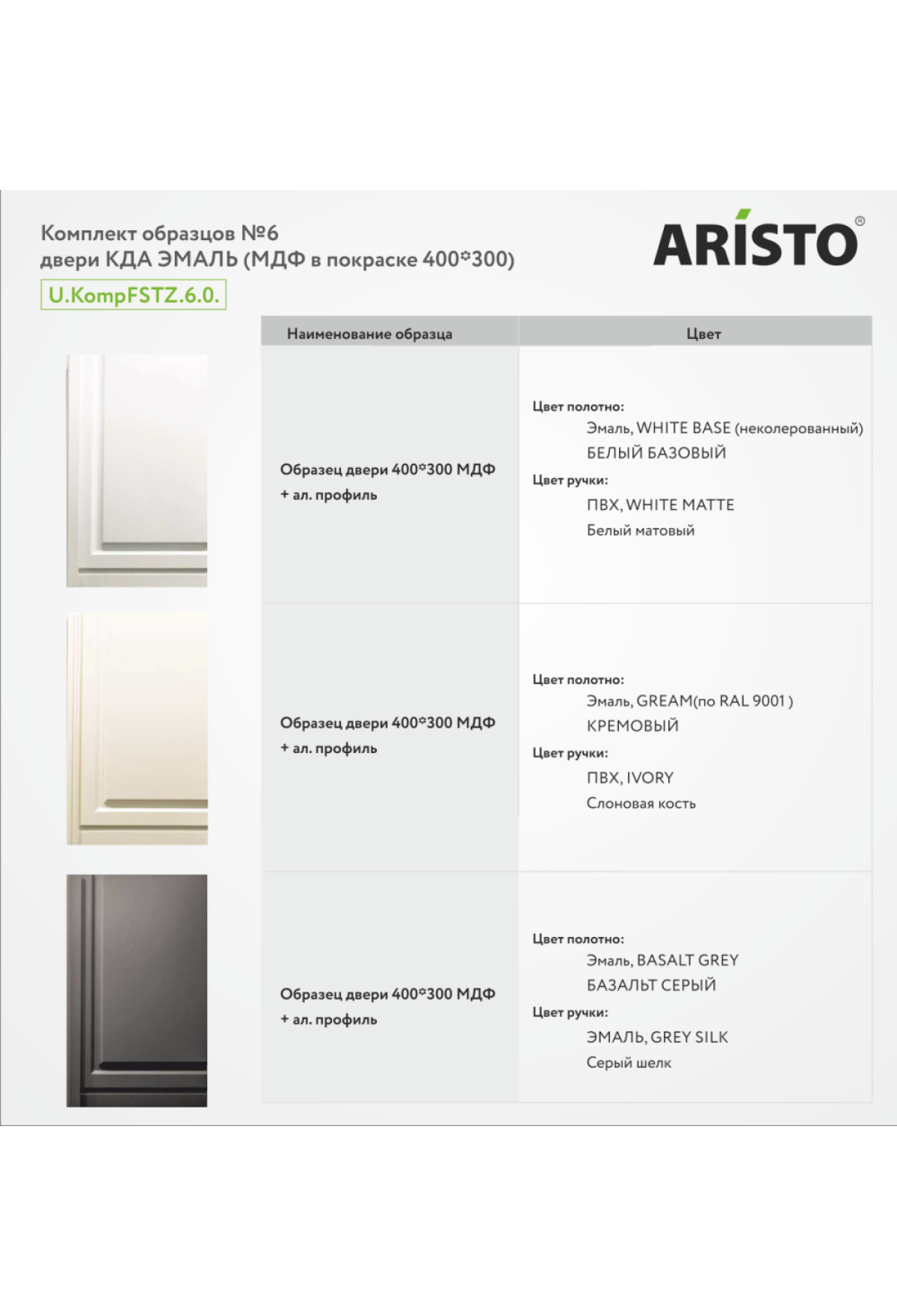 Технические характеристики Комплект образцов №6 эмалей классической коллекции дверей Aristo