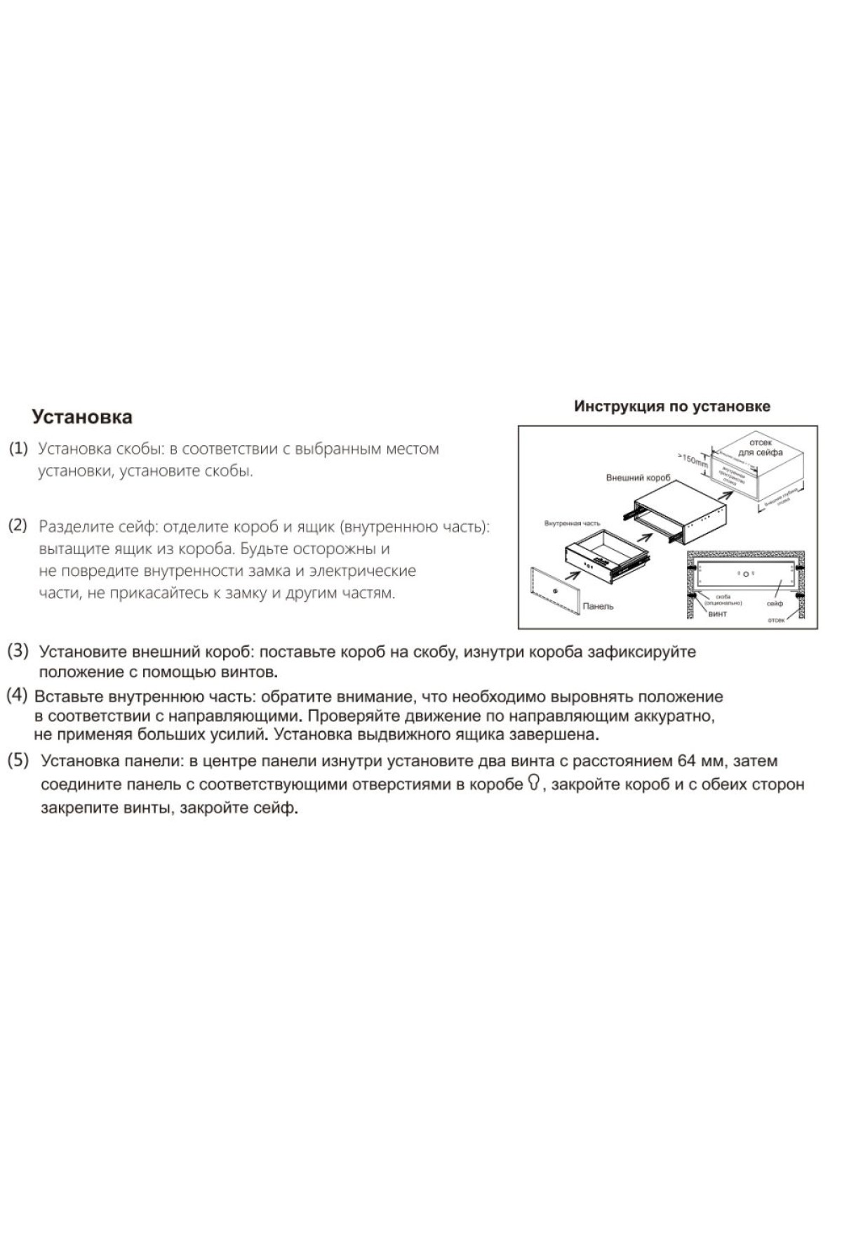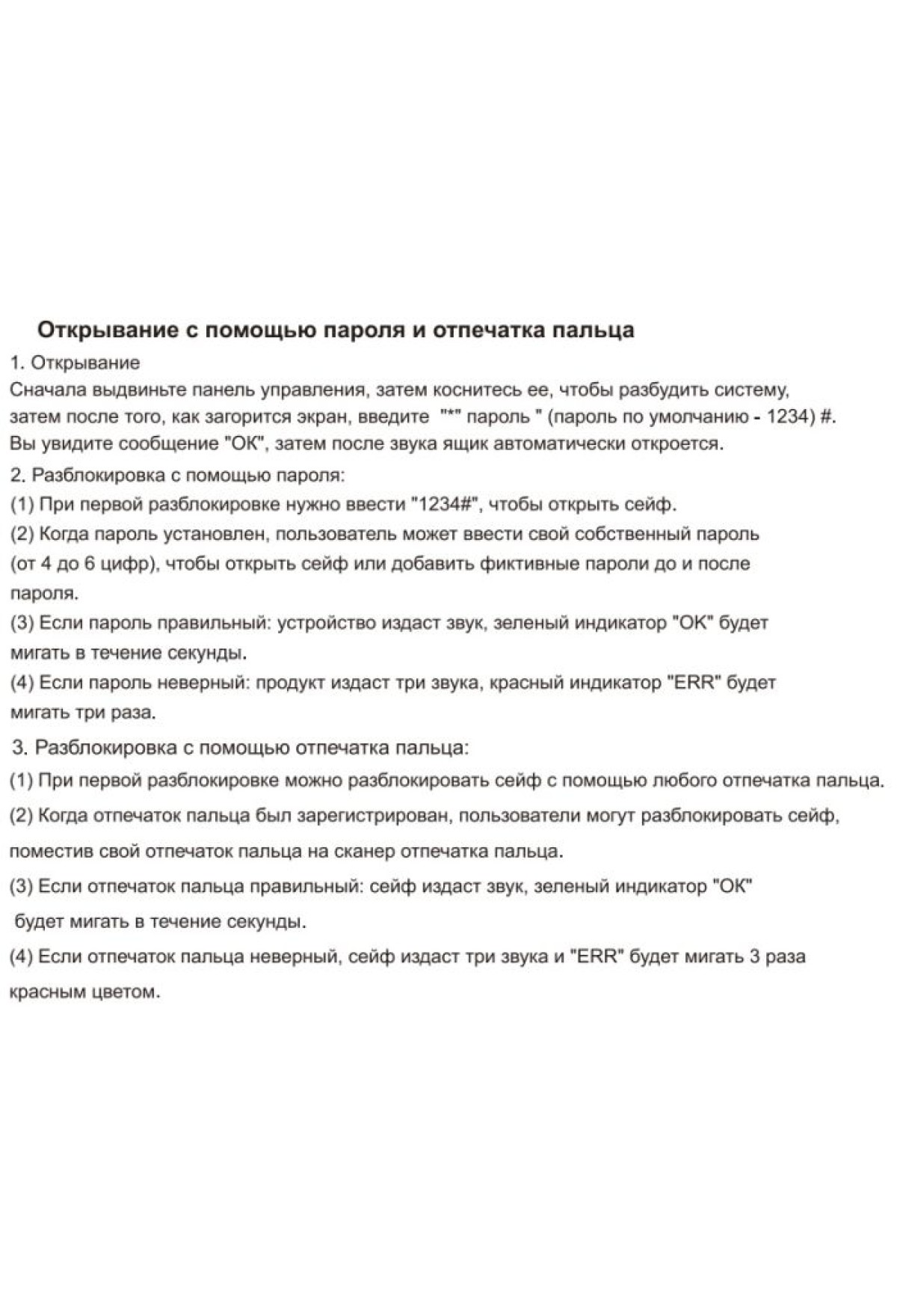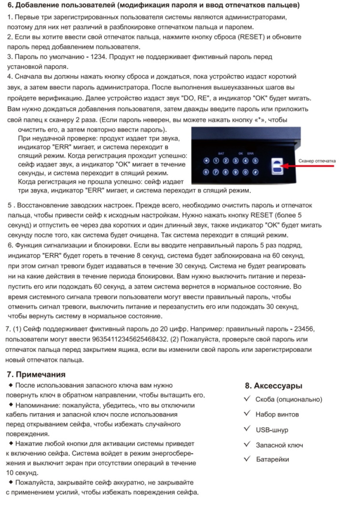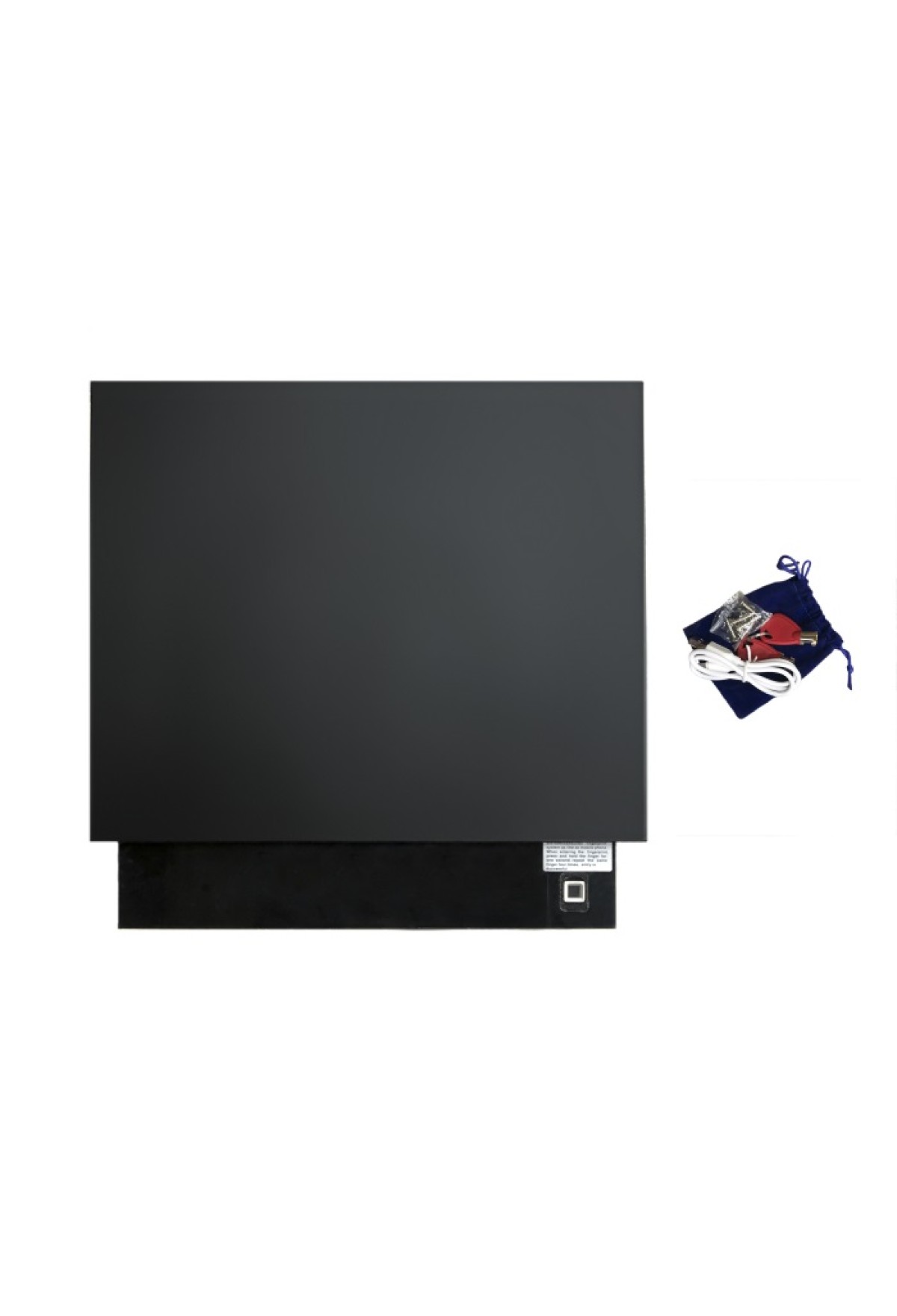 Работает от 4 батареек АА. Имеет много режимов работы: открытие с помощью отпечатка пальца, пароля и запасного ключа. Также в комплект входит USB-провод для работы сейфа от переносной зарядки. Поддерживает функцию фиктивных паролей. Позволяет сохранить 50 отпечатков пальцев в памяти устройства и 10 паролей.