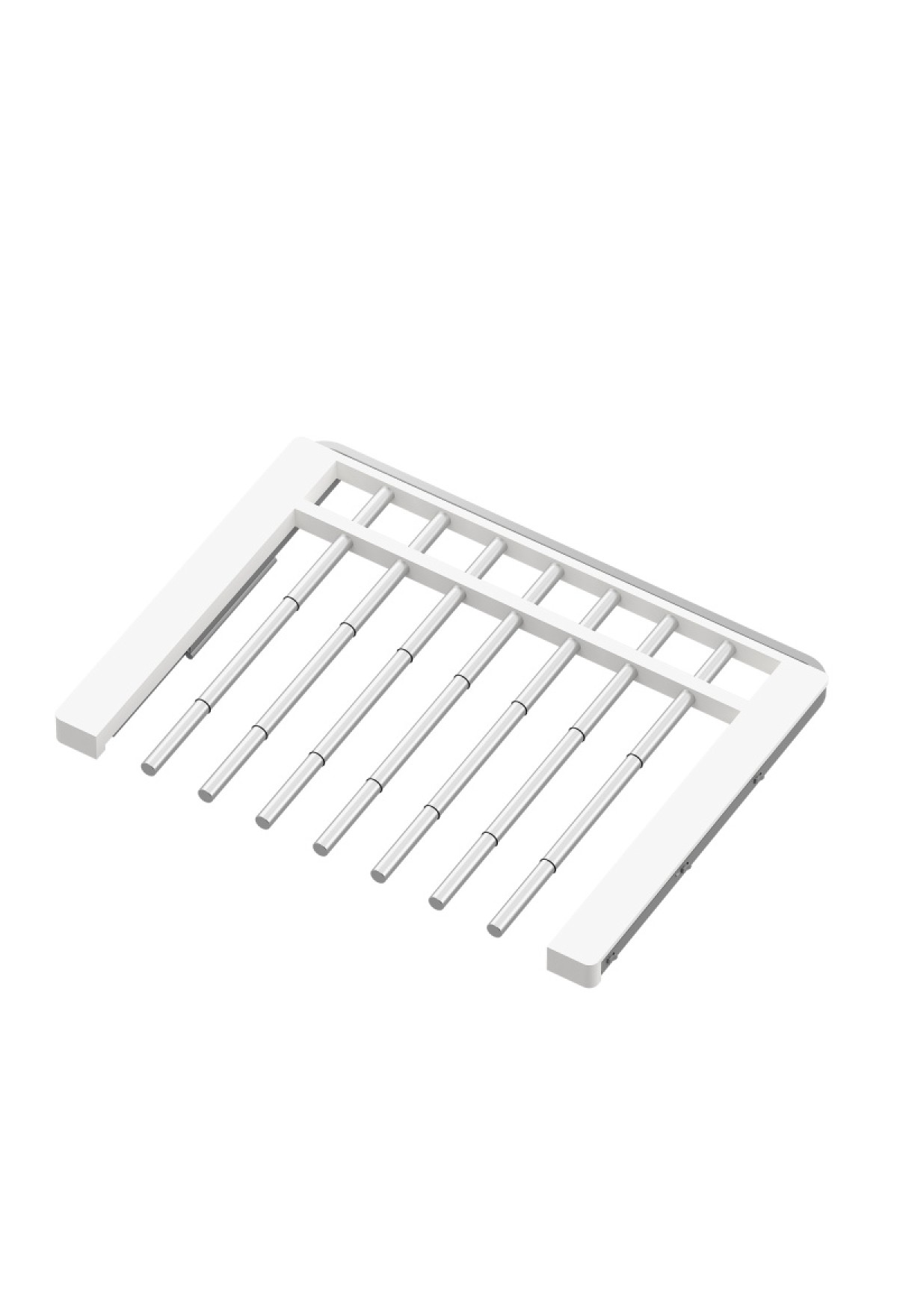 Выдвижная брючница с доводчиком очень удобна в использовании. Вешалка вмещает 7 пар брюк, а силиконовые накладки на перекладинах удерживают их на месте. Вешалка для брюк выдвижная выполнена из стали, устанавливается в гардеробной системе ARISTO с помощью кронштейнов на универсальные направляющие. Выдвижной механизм с доводчиком легко скользит при открывании и плавно закрывает. Декоративная рама из белого дерева придает гардеробной респектабельность.