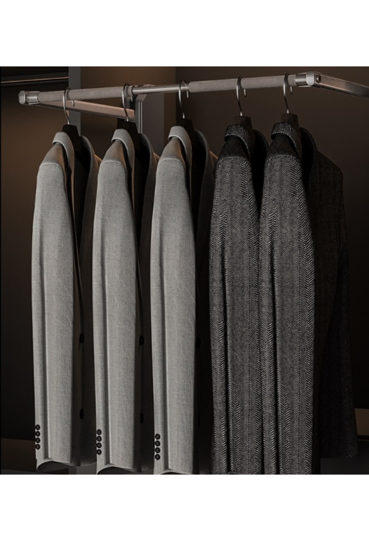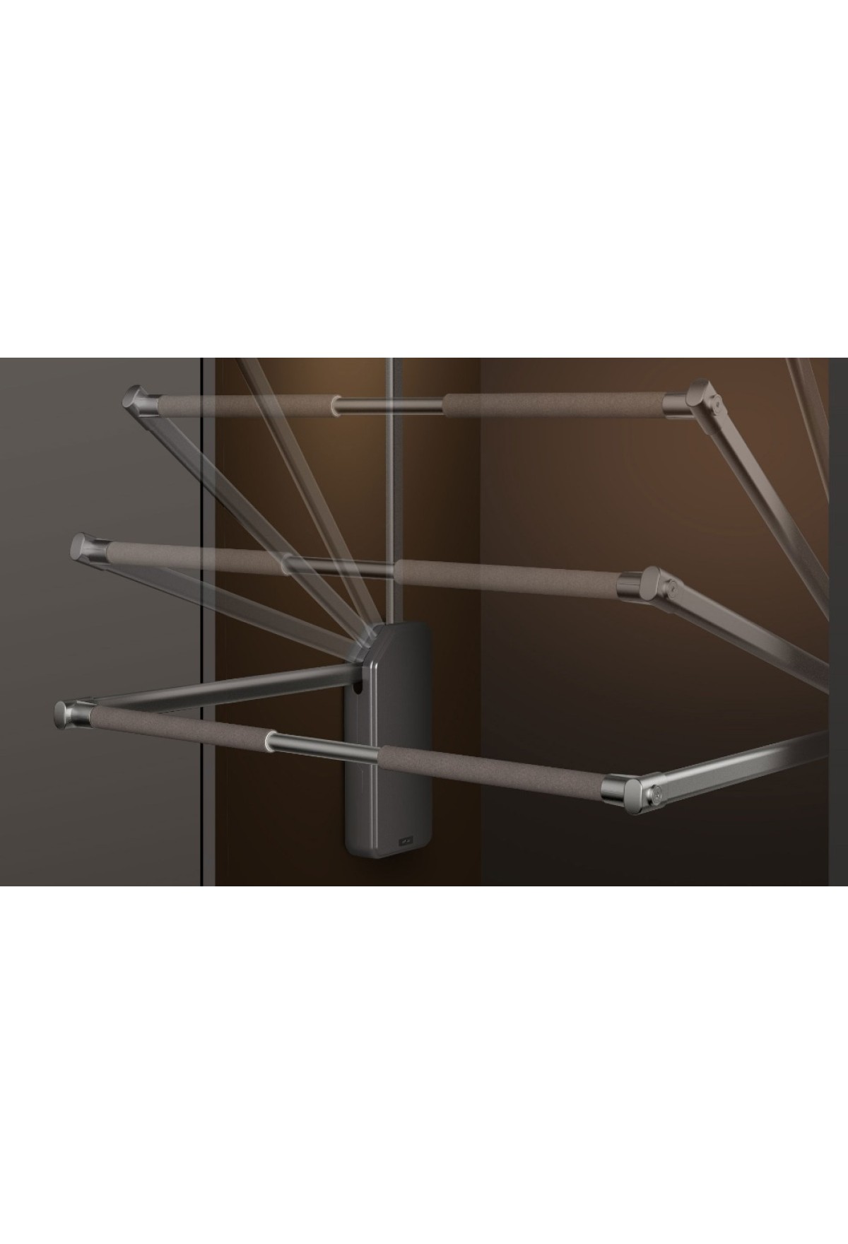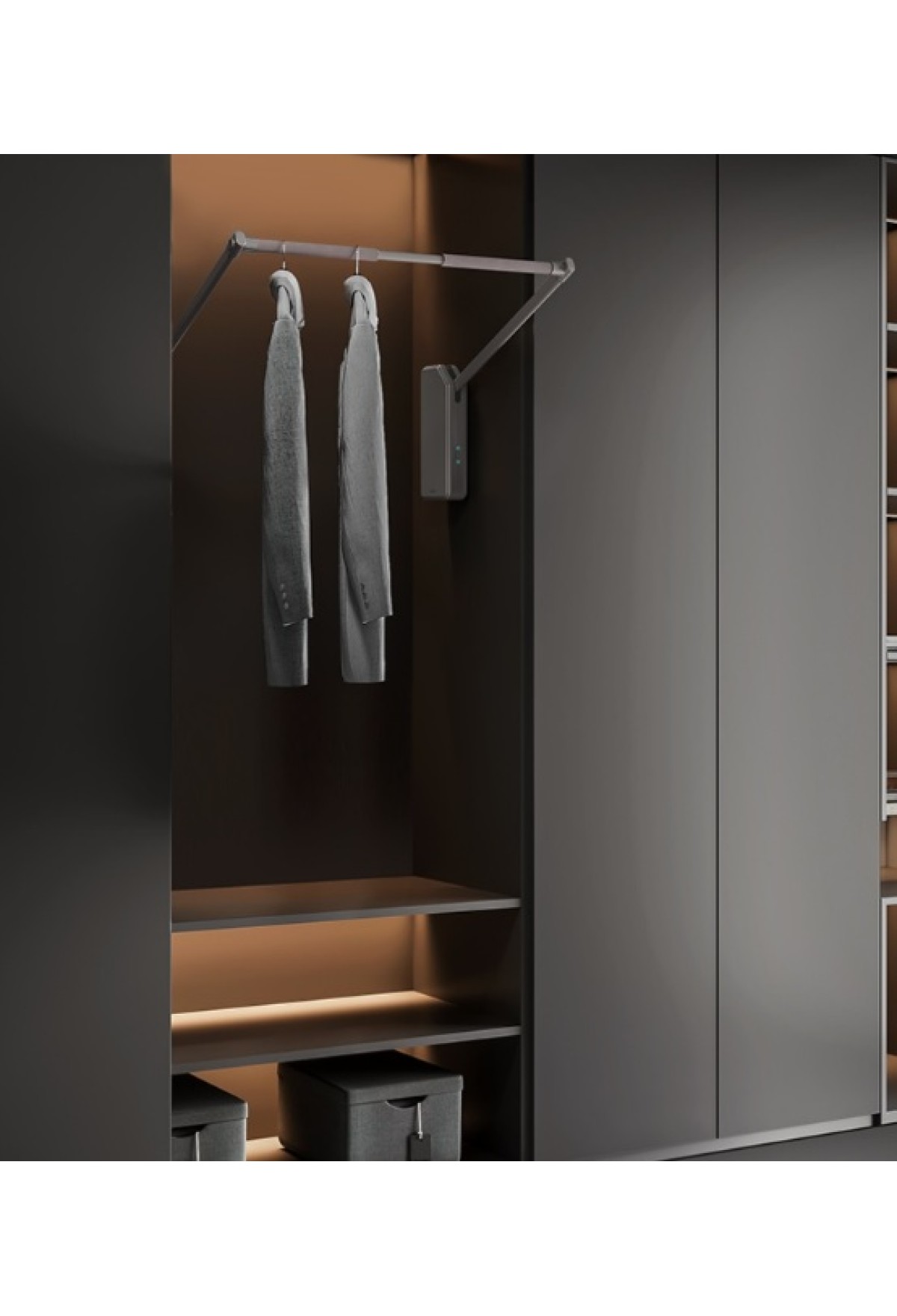 Чтобы удобно доставать с пантографа повешенные вещи нужно просто нажать на кнопочку пульта, либо на сенсорную панель самого пантографа, он опустится и зафиксируется. Чтобы его поднять в исходное положение аналогично можно нажать на пульт, либо на сенсорную панель. Все остальное за Вас сделает сервопривод.