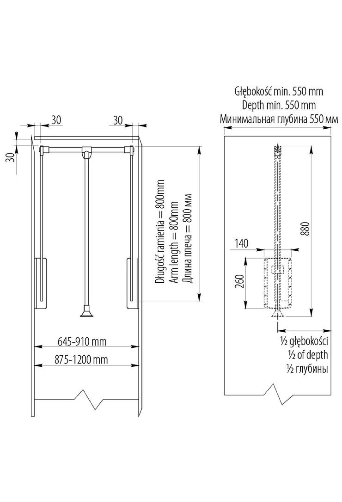 Телескопическая штанга перед установкой в шкаф регулируется в пределах 60-83 см