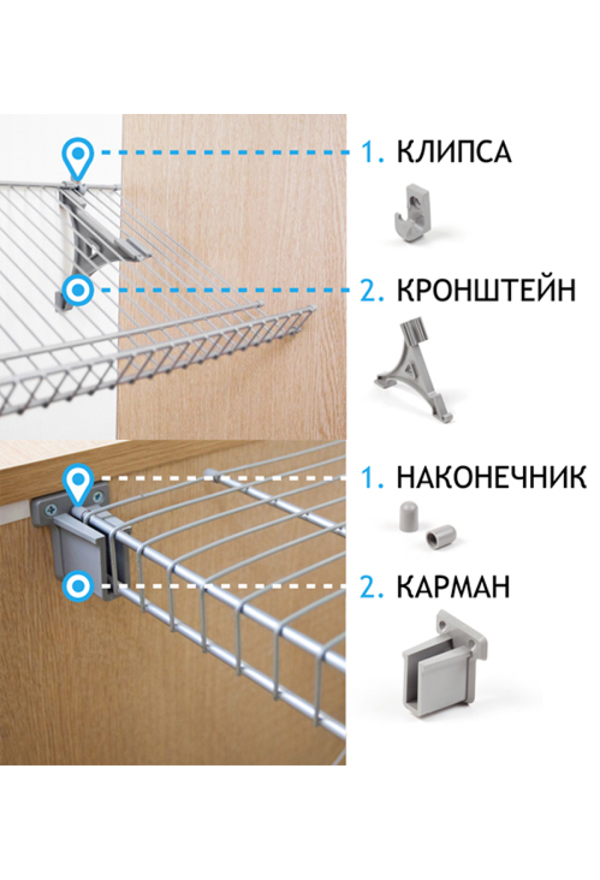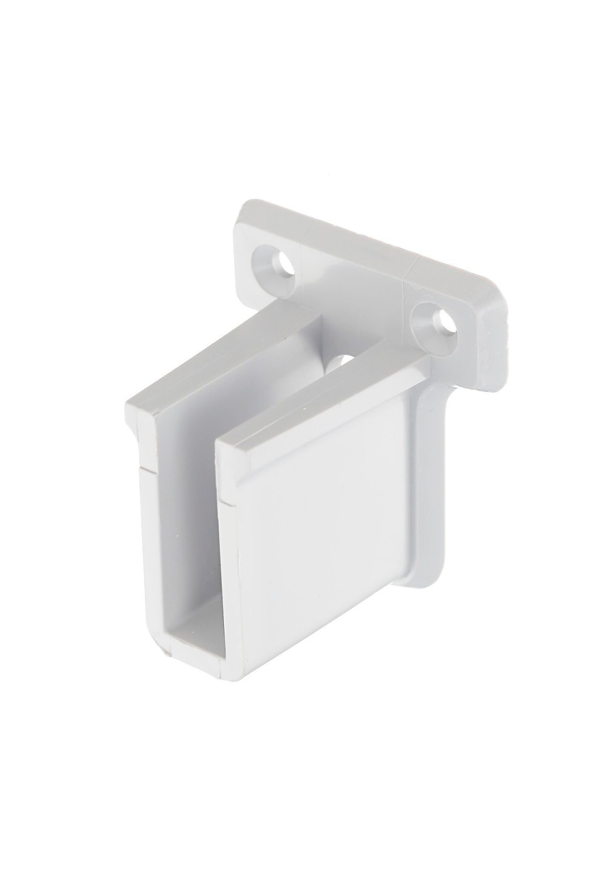 Карман сетчатой полки, белый - фиксирующий элемент, используемый для крепления фронтальной части полки к боковой части мебельной конструкции.