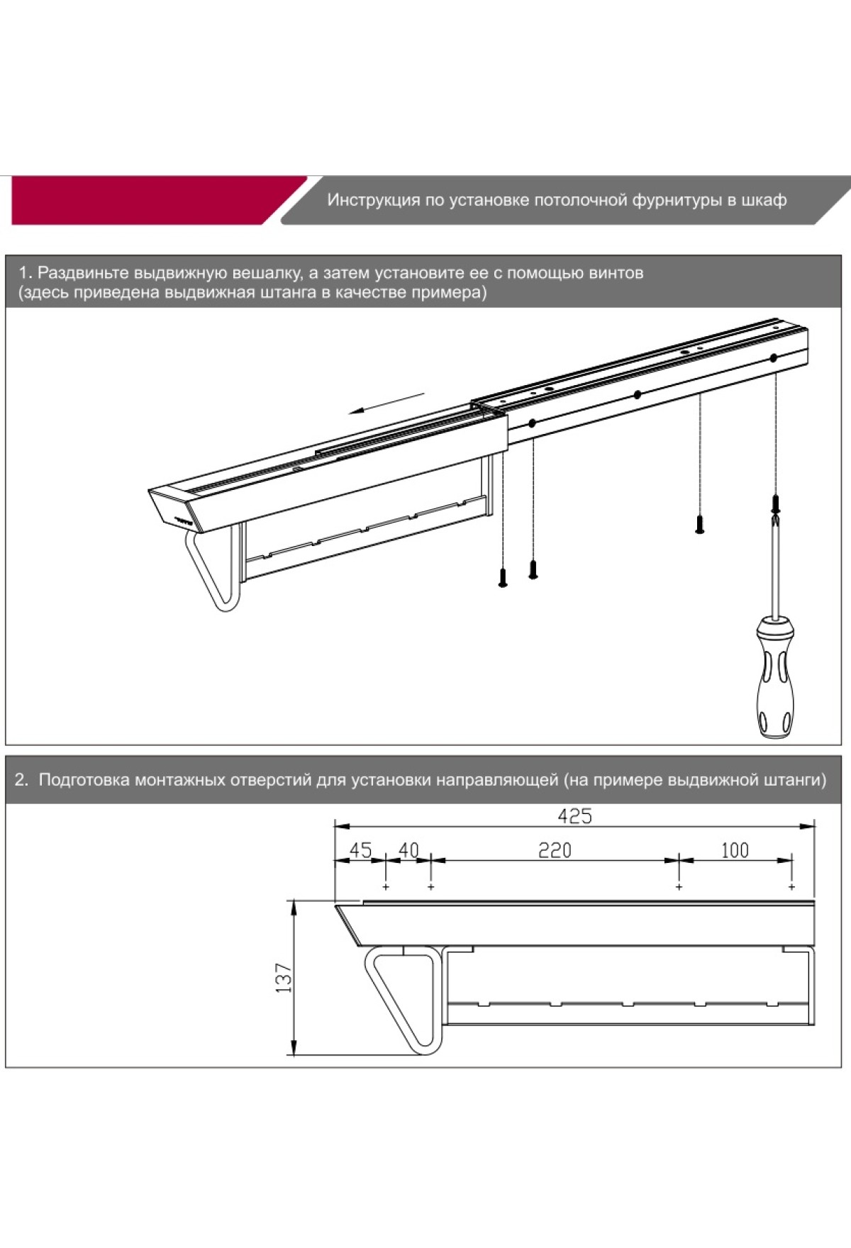 Фиксируется на потолке шкафа с помощью винтов. Штанга перемещается легко и плавно. Имеет встроенный доводчик, который устанавливает и фиксирует ее в закрытом положении.