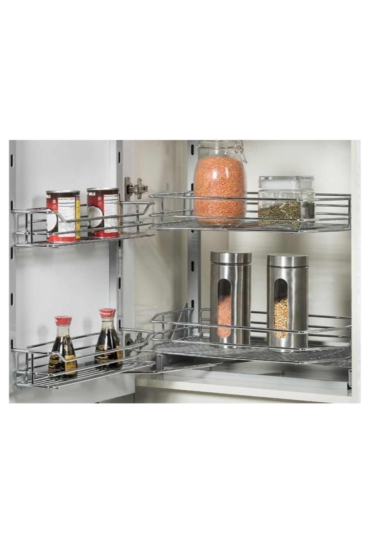 Шкаф-колонна устанавливается в кухонный шкаф и полностью выдвигается вместе с фасадом, создавая максимальный доступ ко всем вещами, которые хранятся внутри.