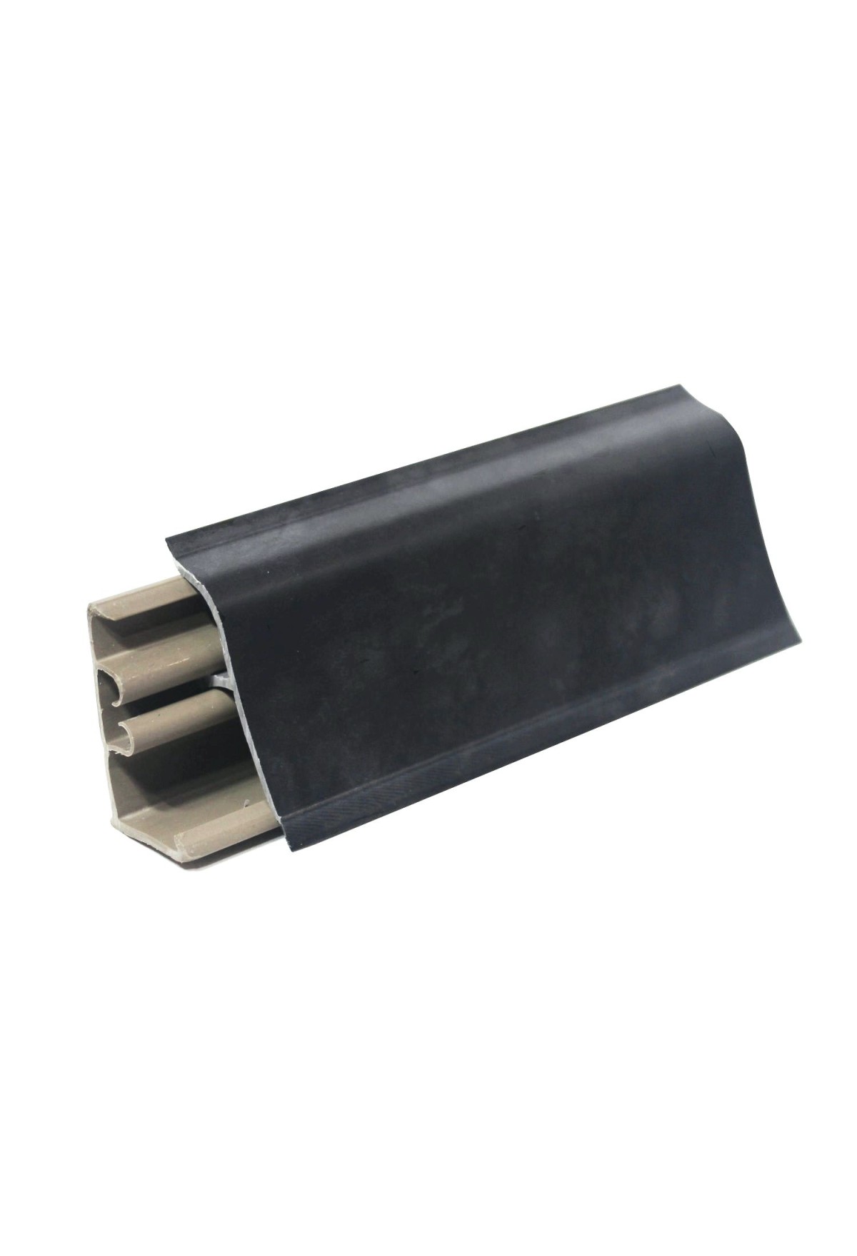 Особенность новой конструкции являются уплотнительные края, которые теперь интегрированы на лицевую поверхность плинтуса и имеют 100% заливку по цвету - т.е. и резинка и плинтус идут одного декора.