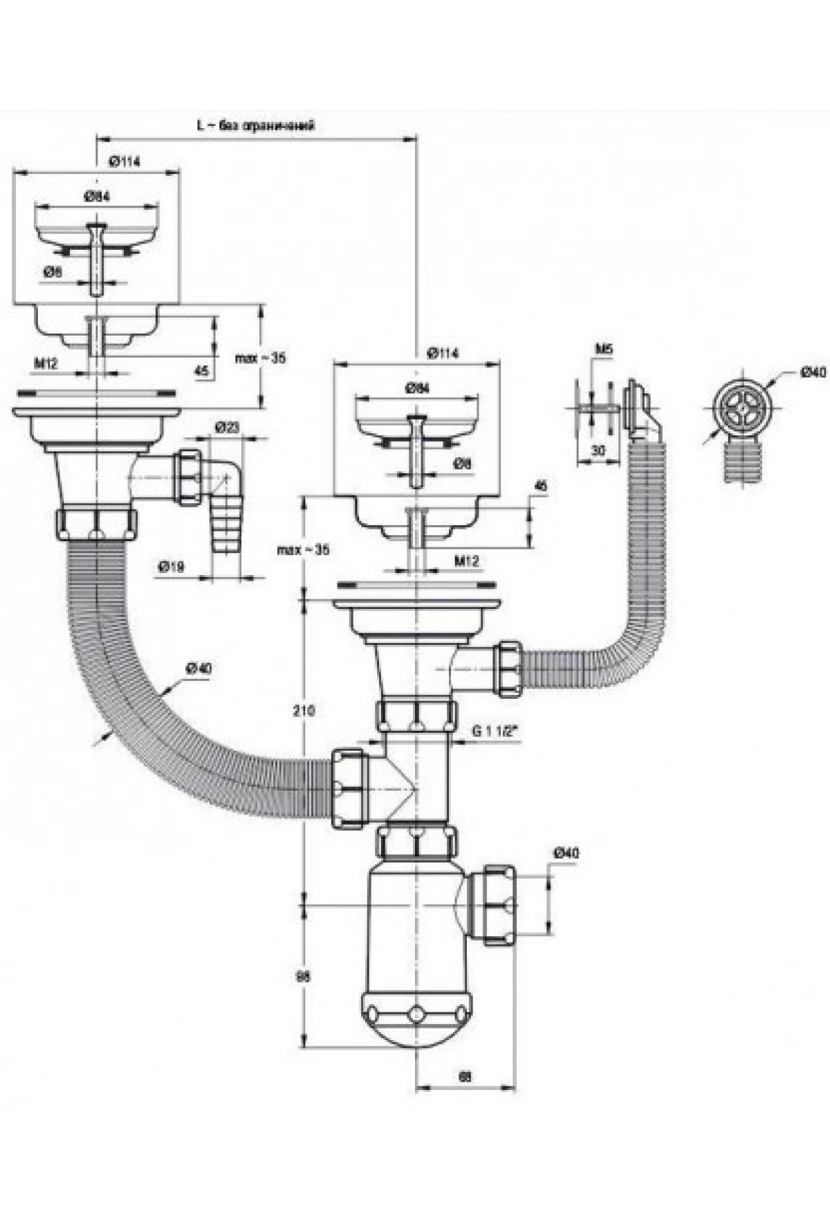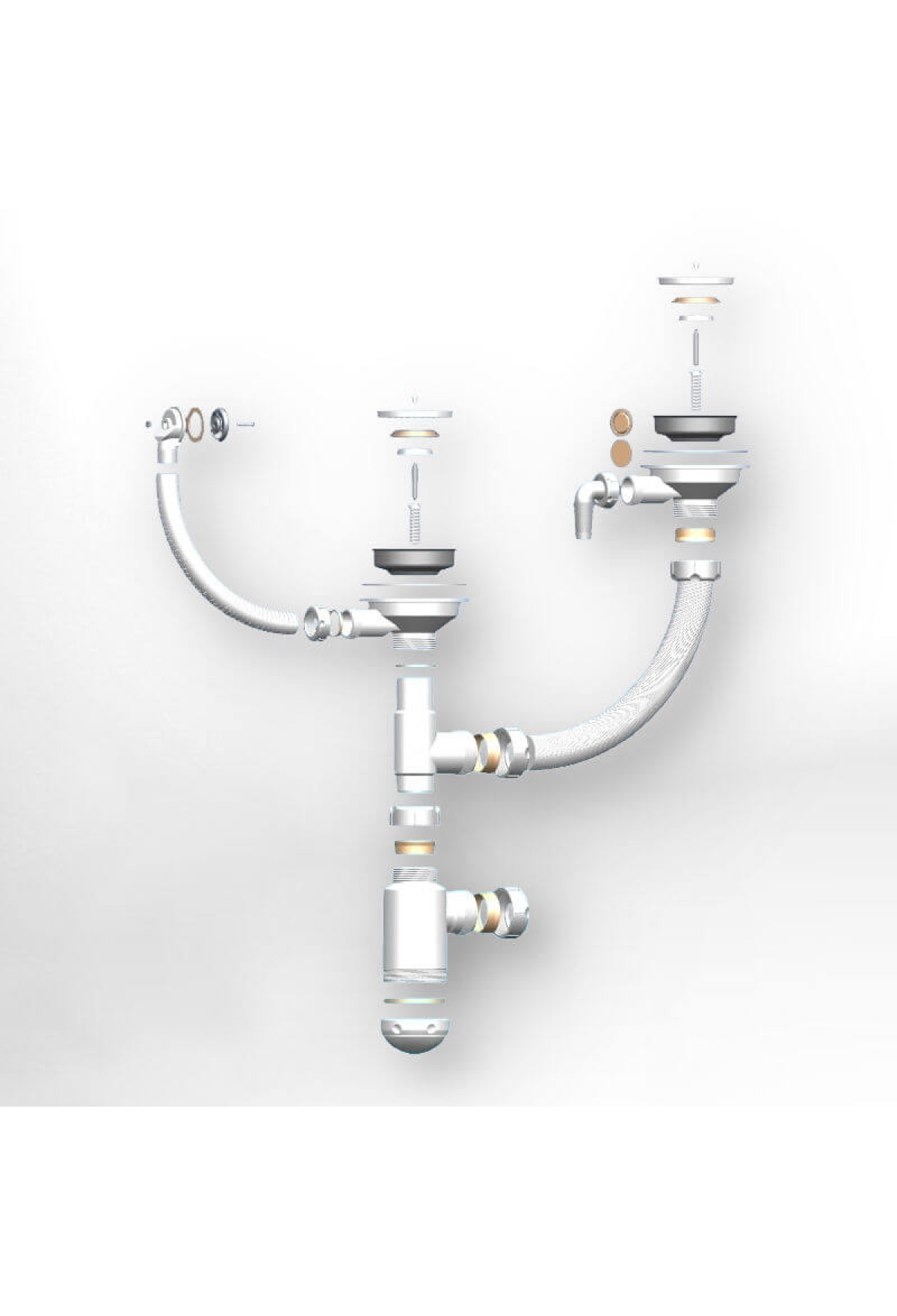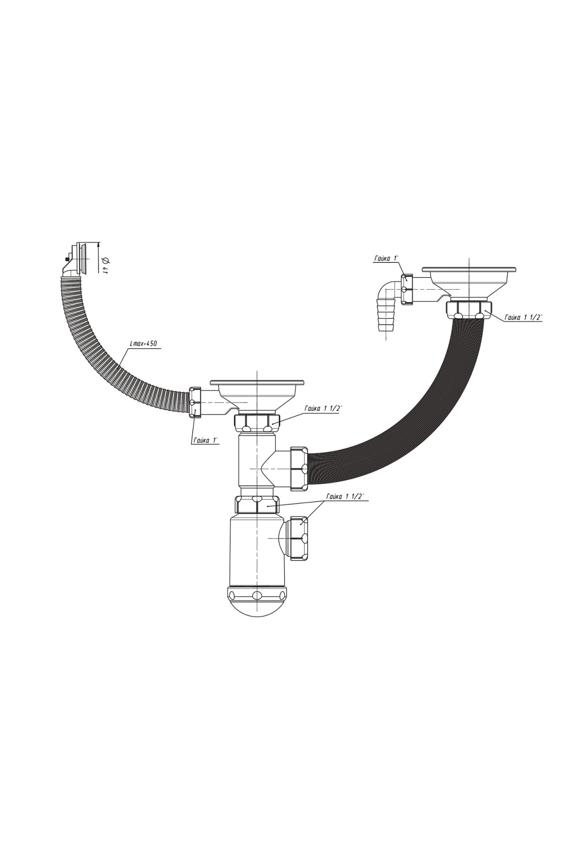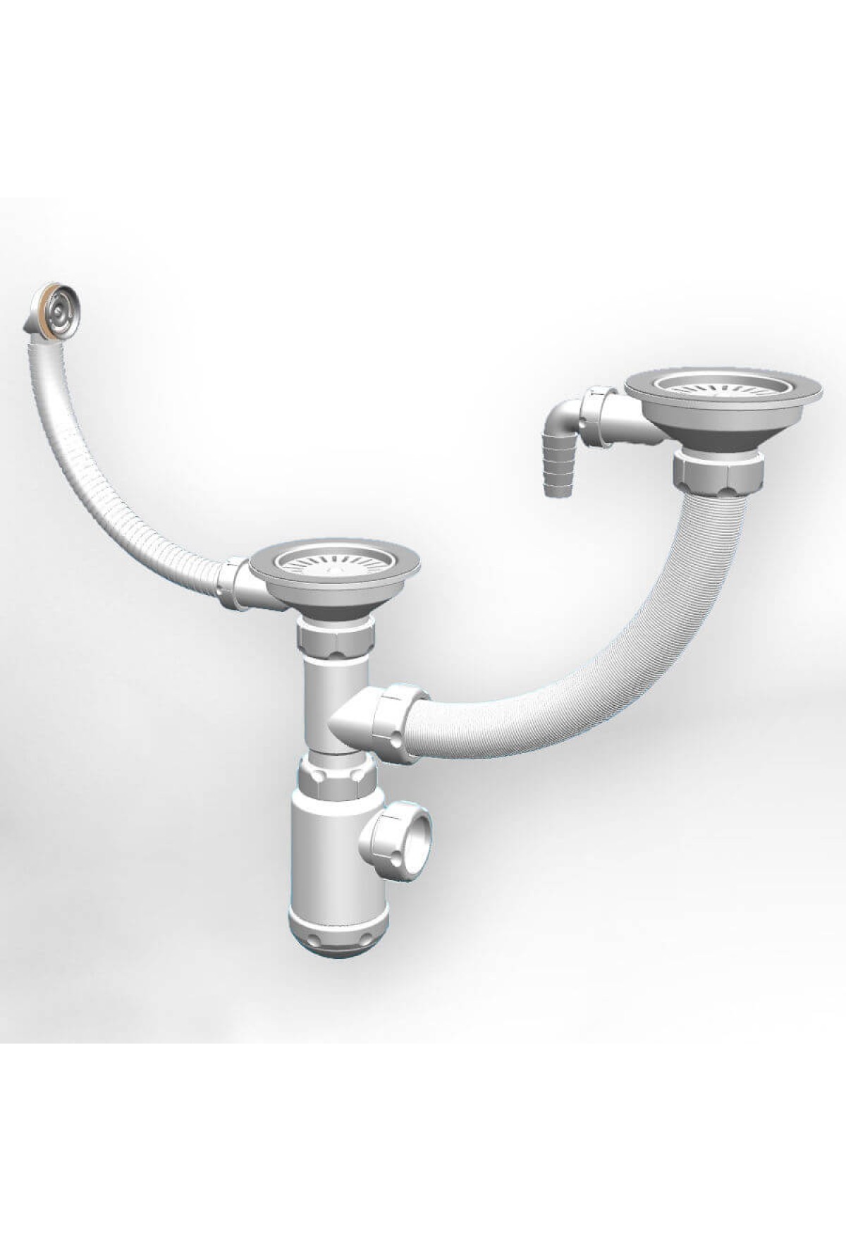 Выпуск для разноуровневых полуторачашевых и двухчашевых моек в комплекте с сифоном. Подходит для полуторачашевых и двухчашевых моек с круглым переливом со сливными отверс тиями диаметром 3 1/2", с возможностью подключения к посудомоечной машине .