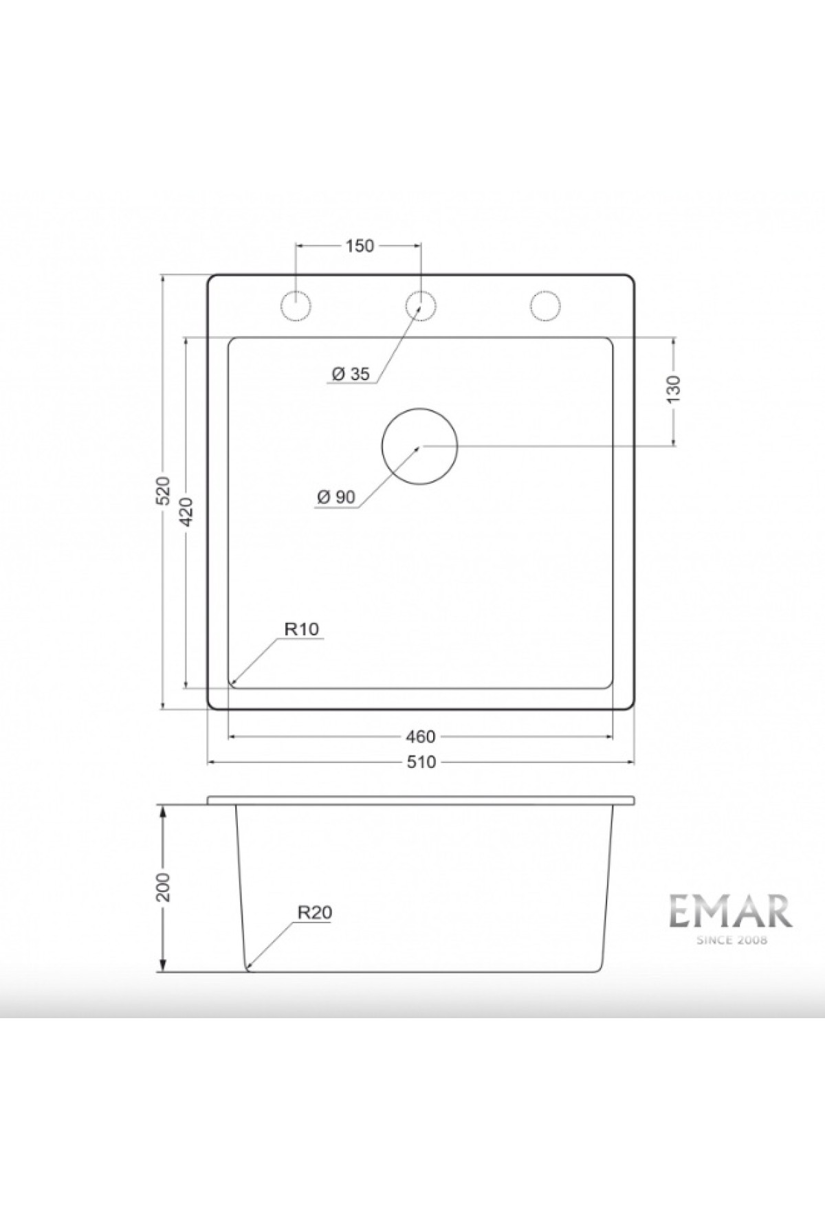 Технические характеристики мойка кварцевая EMAR EMQ-1510.Q сардоникс 510*520*200мм