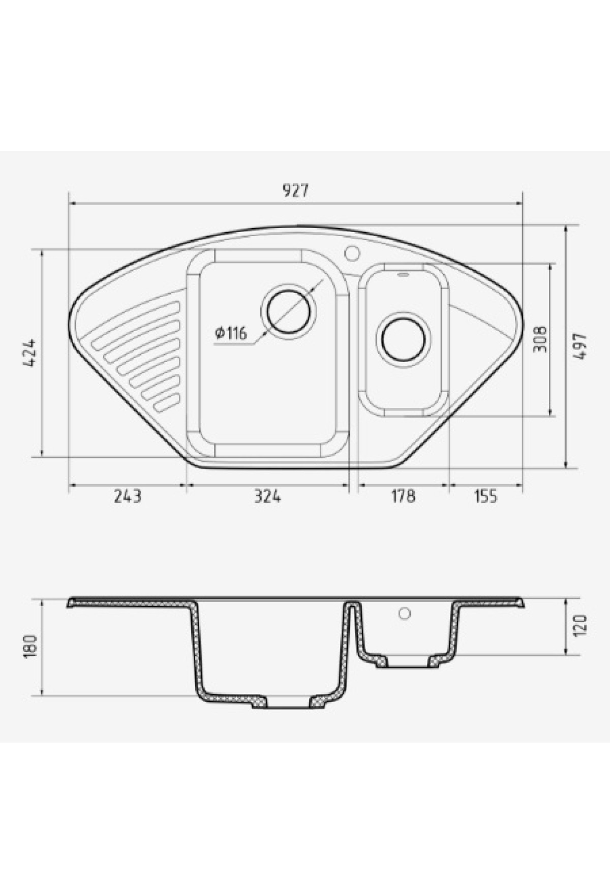 Технические характеристики мойка кварцевая угловая GranFest QUARZ 14, черный, 927*497*180 мм(без сифона)