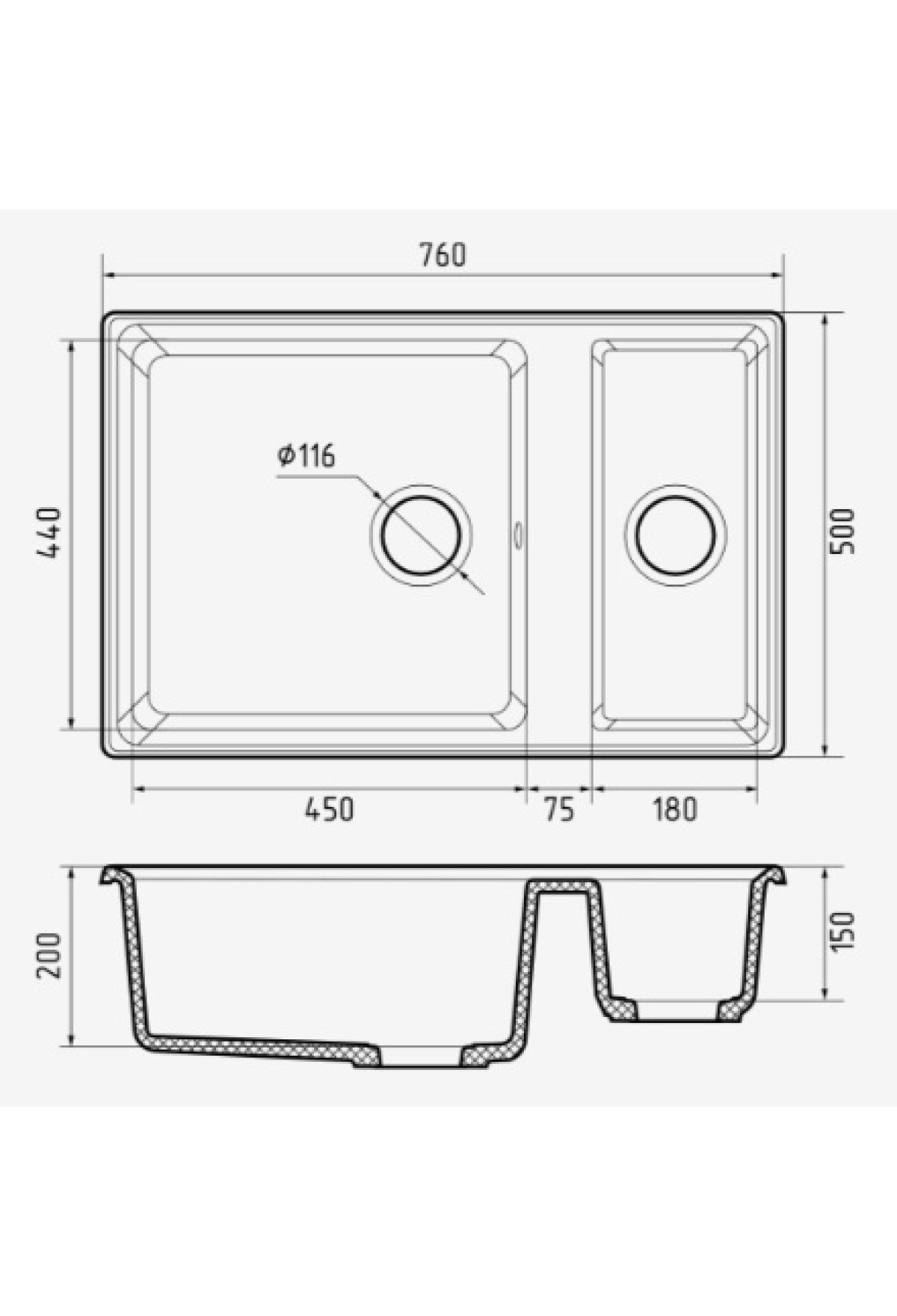 Кухонная мойка оснащена 2-мя чашами. Вы можете выполнять несколько задач одновременно, мыть посуду, обрабатывать и сушить овощи, размораживать продукты.