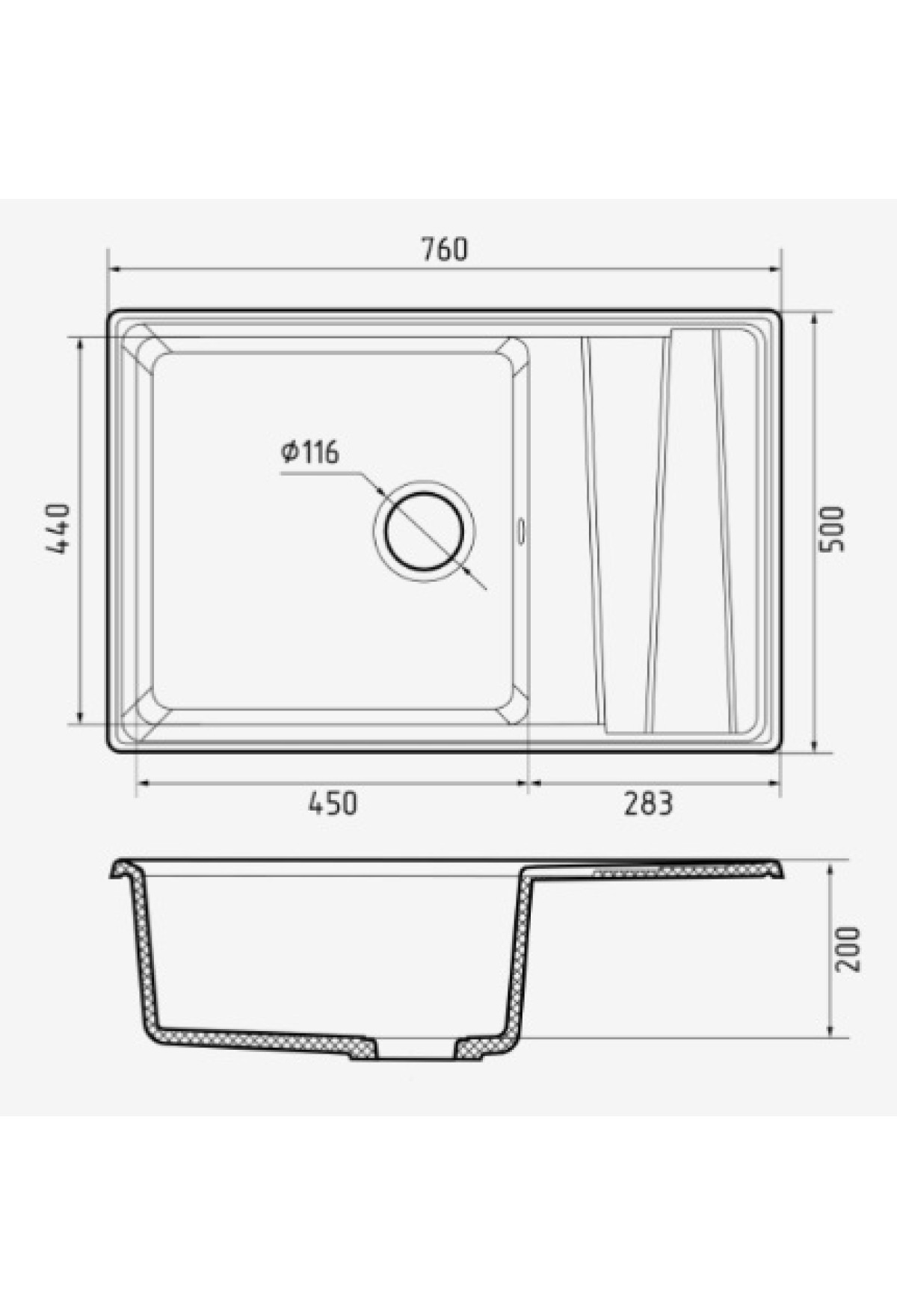 Благодаря продуманной эргономике и оригинальному дизайнерскому решению крыла ее можно установить в шкаф шириной 600 мм. Дизайнерскую модель отличают большая практичная чаша размером 450*440 мм, и глубиной 200 мм, которая с легкостью позволит разместить внутри крупногабаритную посуду и промывать ее без лишних усилий. Игра плоскостей на функциональном крыле помогает удобно расположить уже вымытую посуду, чтобы с нее стекала вода.