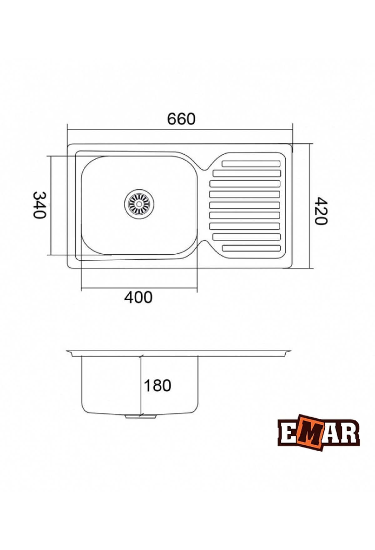 Технические характеристики мойка EMAR 6642 нерж.сталь врезная 660*420*180*0,8