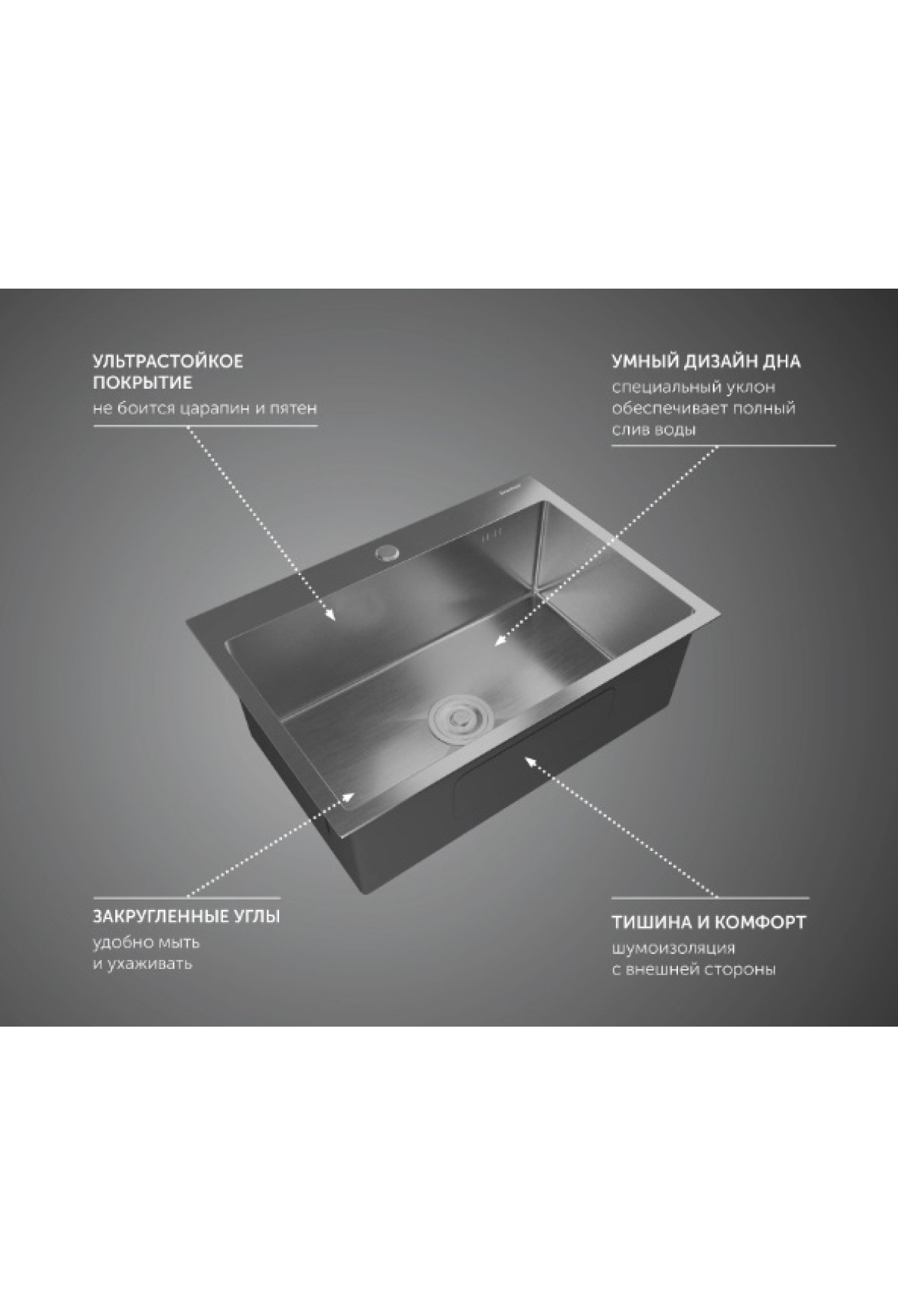 ✔ Отсутствие шума - за счет толщины металла, специального шумоподавляющего покрытия и полимерных накладок с обратной стороны мойки.