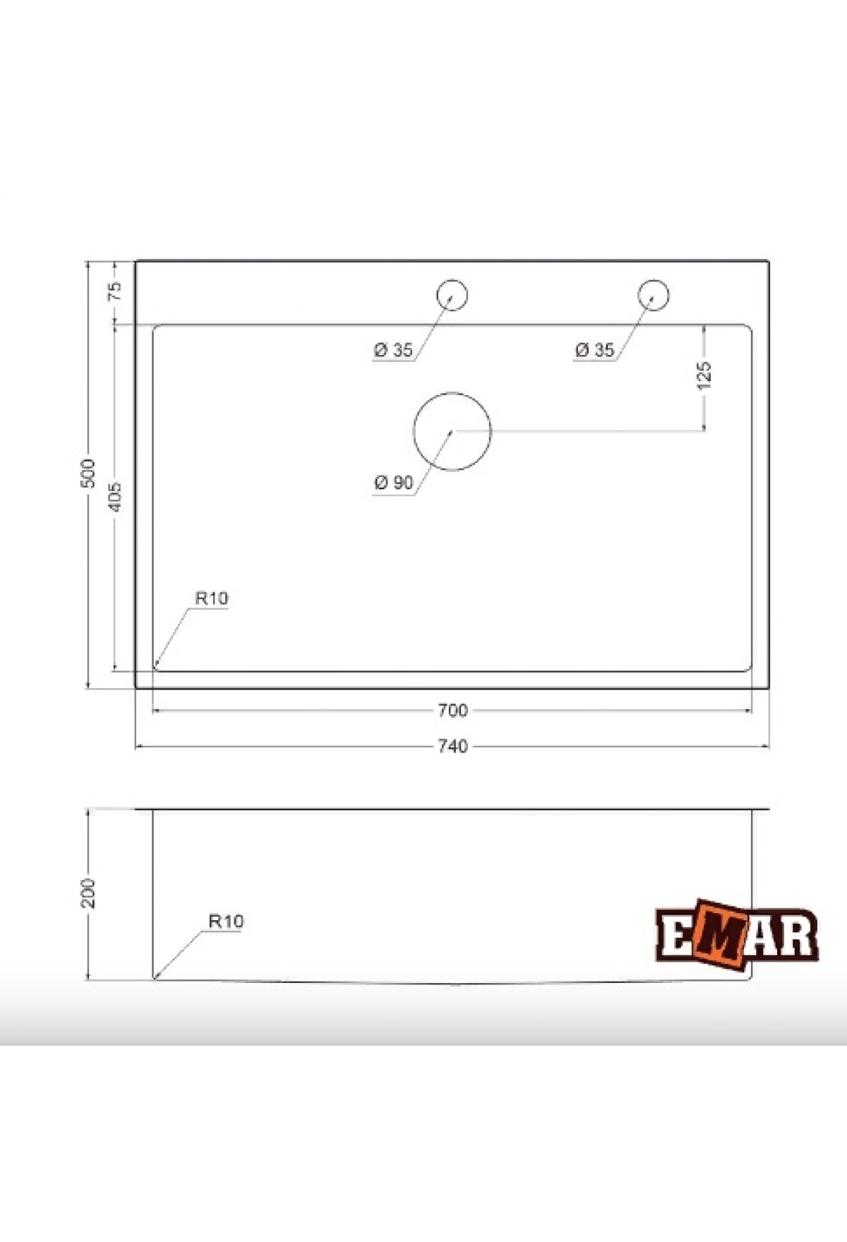 Дизайнерская мойка имеет размеры 740 x 500 мм и R5 радиус закругления с внешней стороны. Внутренние углы с R10 радиусом закругления.