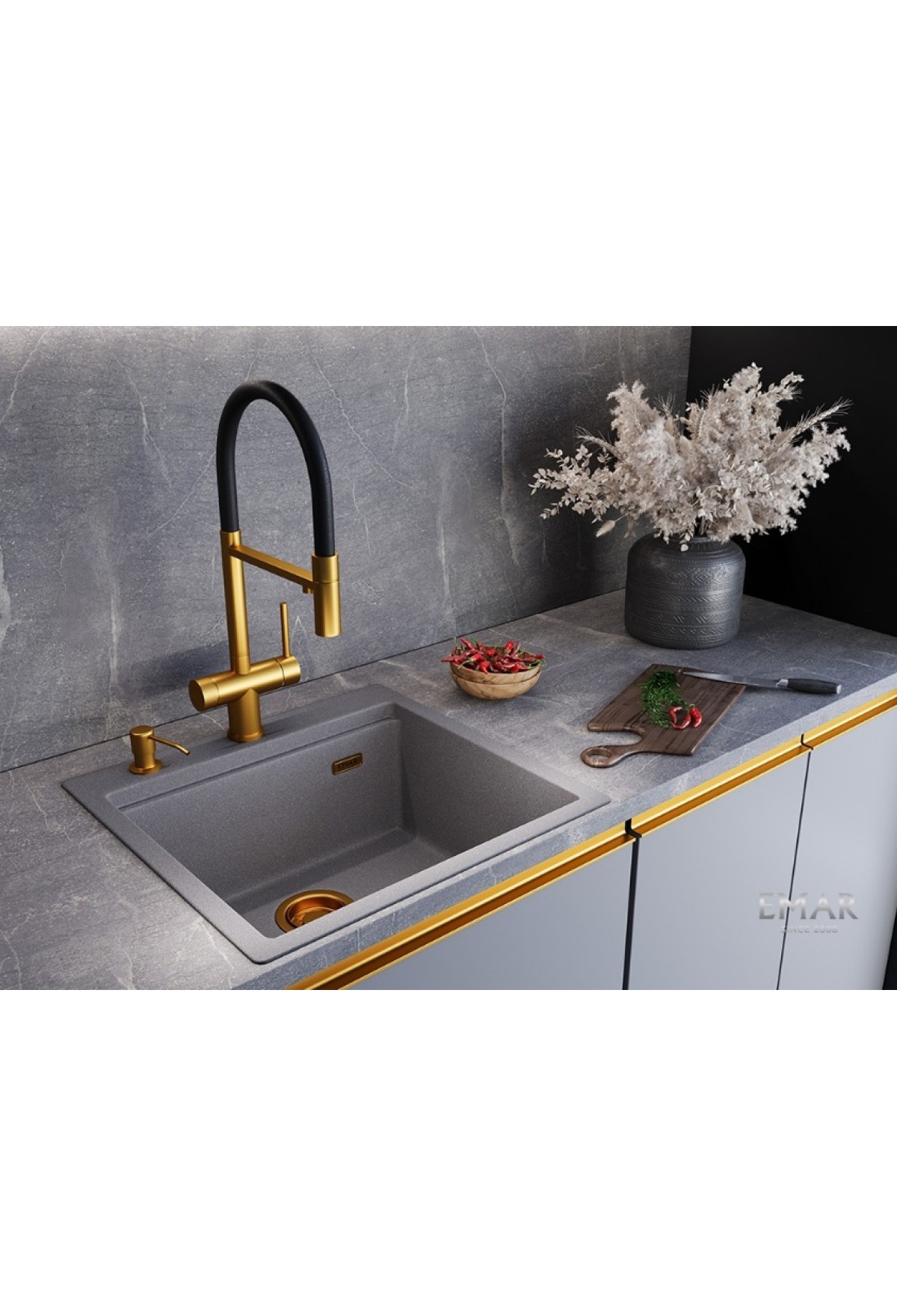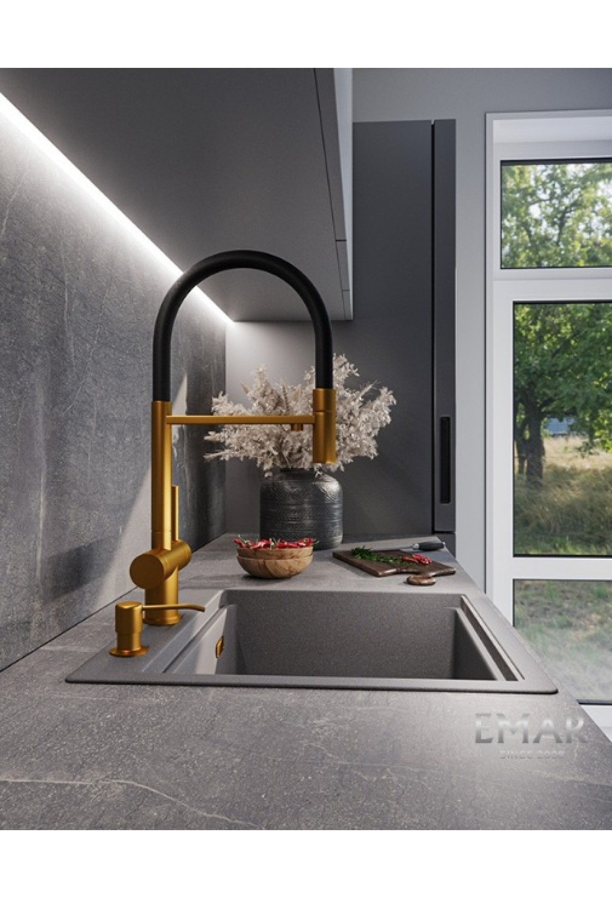 Кухонный смеситель с возможностью подключения фильтра для очистки воды. Фильтрованная вода подается отдельной ручкой через отдельную трубку и не смешивается с водопроводной водой.