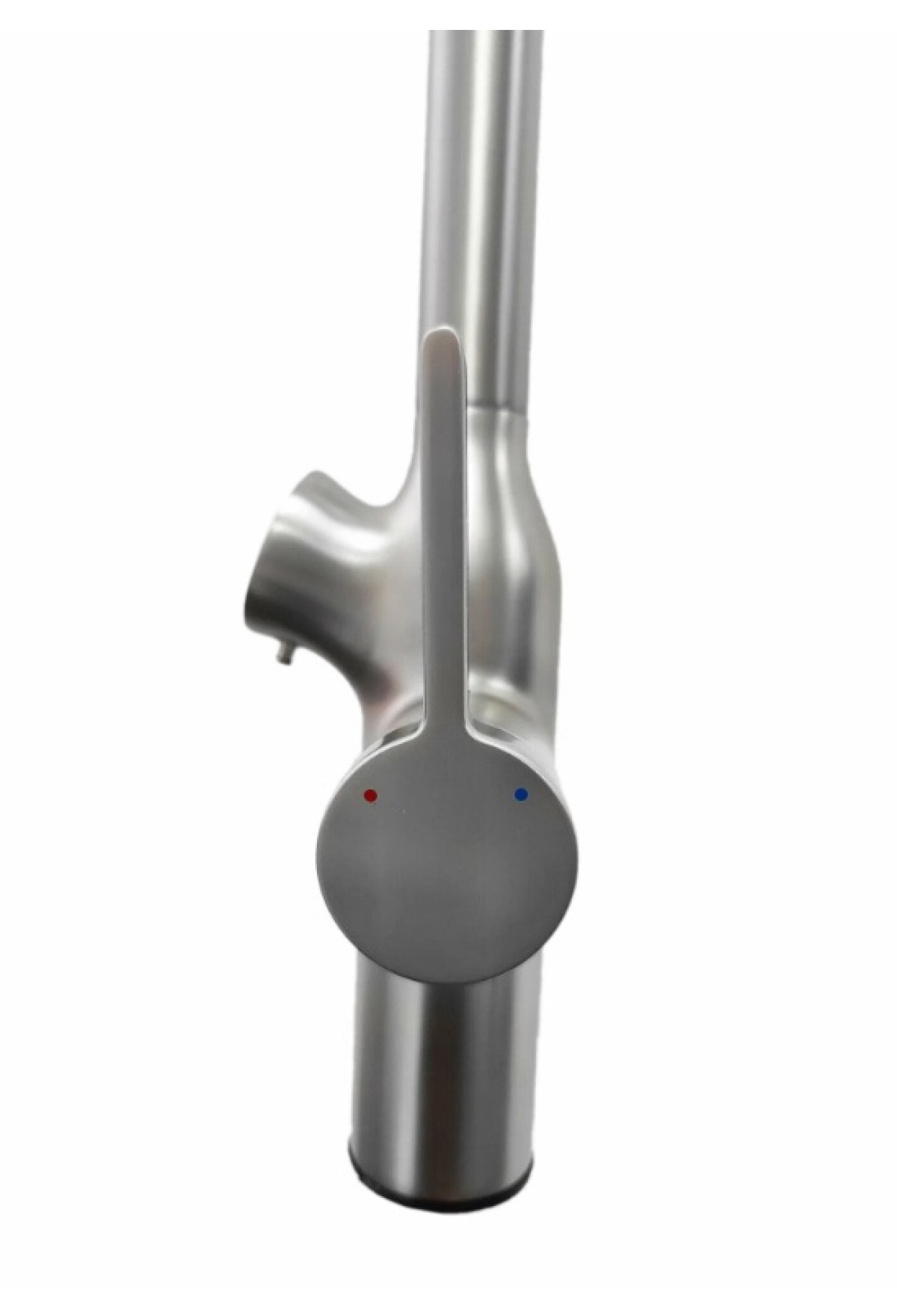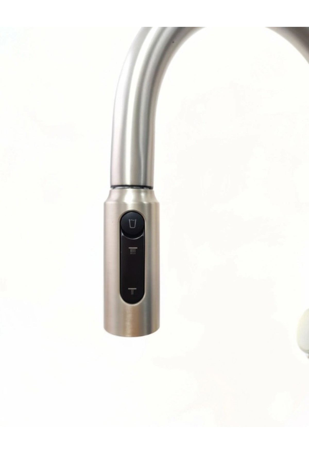 Смеситель OULIN OL-8018 Satin - это стильный и функциональный кухонный смеситель, который сочетает в себе выдвижной излив, переключение подачи воды (струя/душ), подключение фильтра для питьевой воды и встроенный сенсорный дозатор для жидких моющих средств.