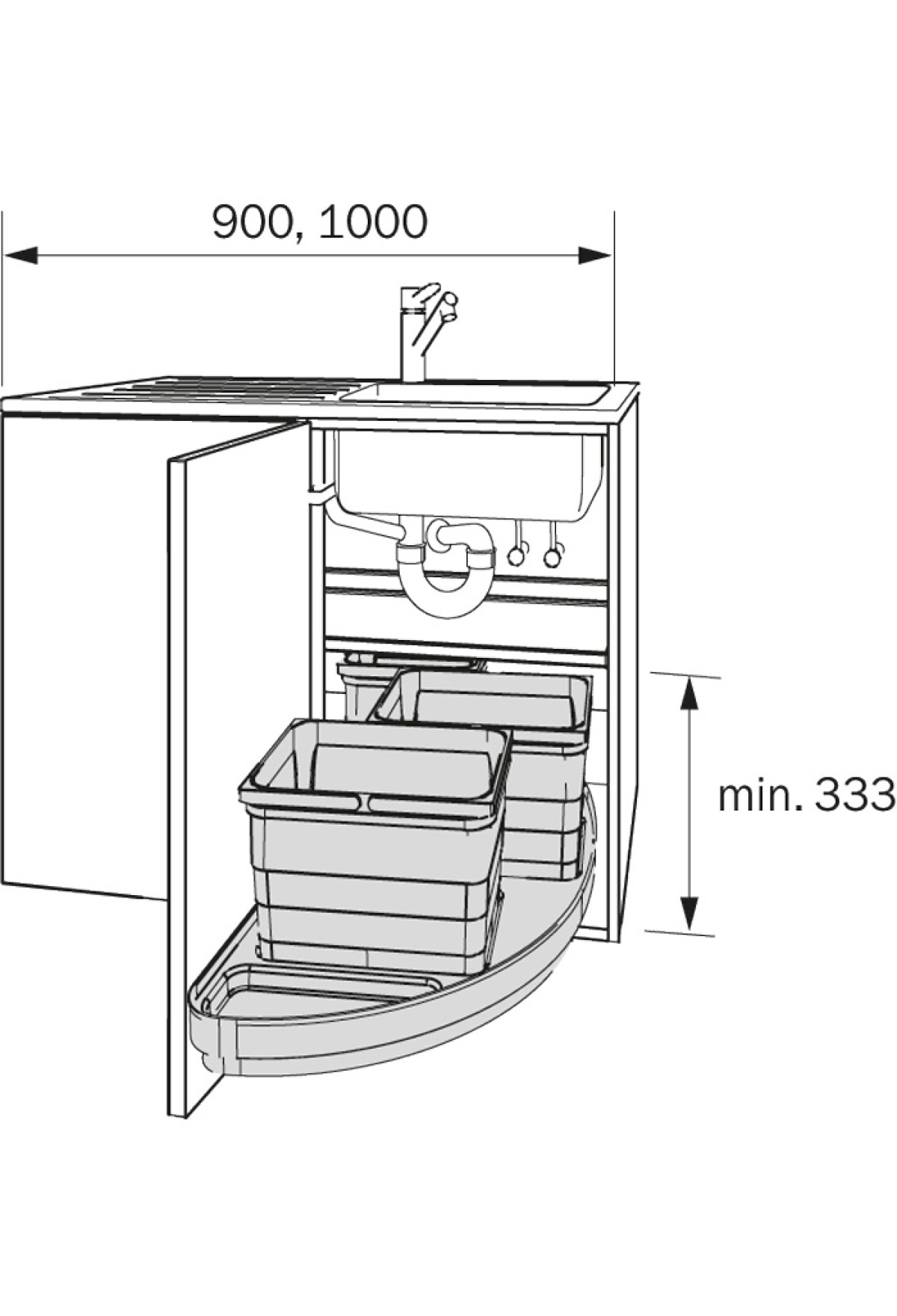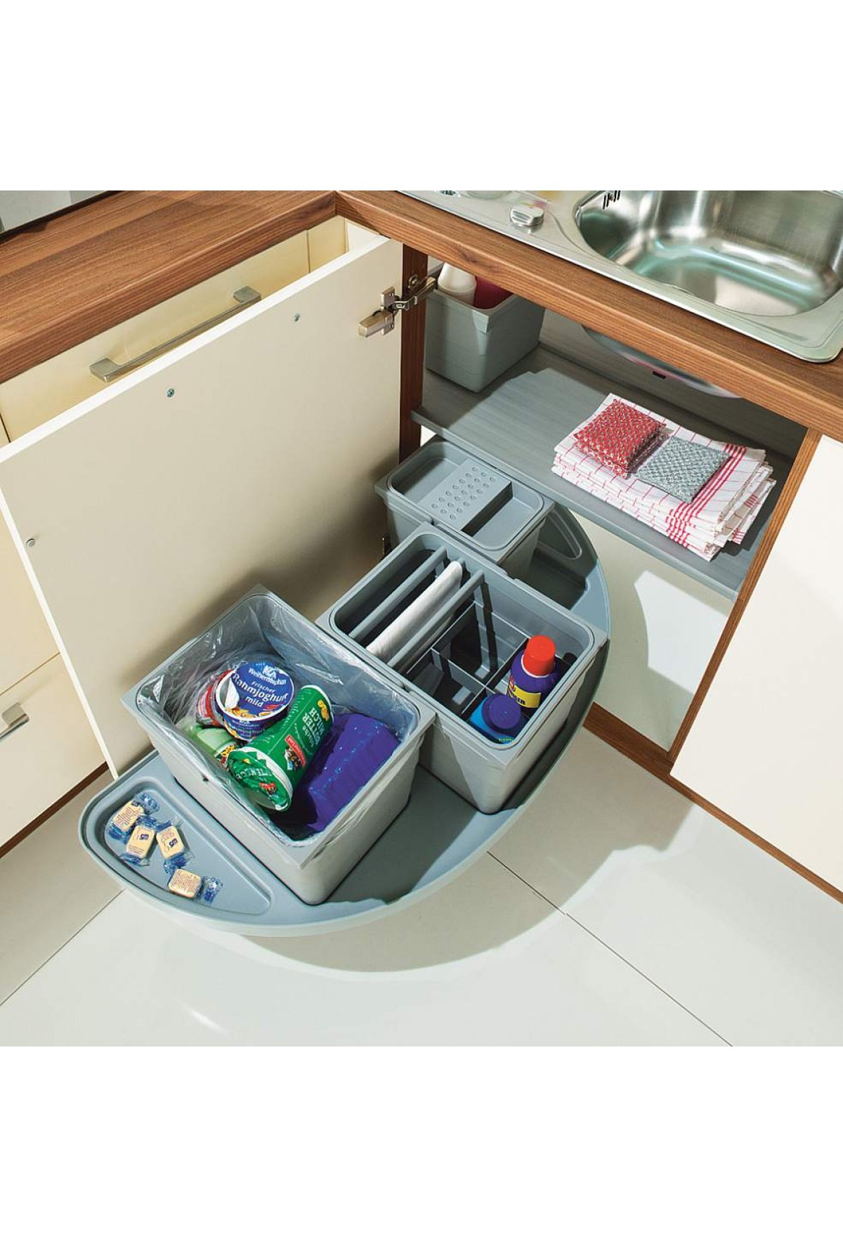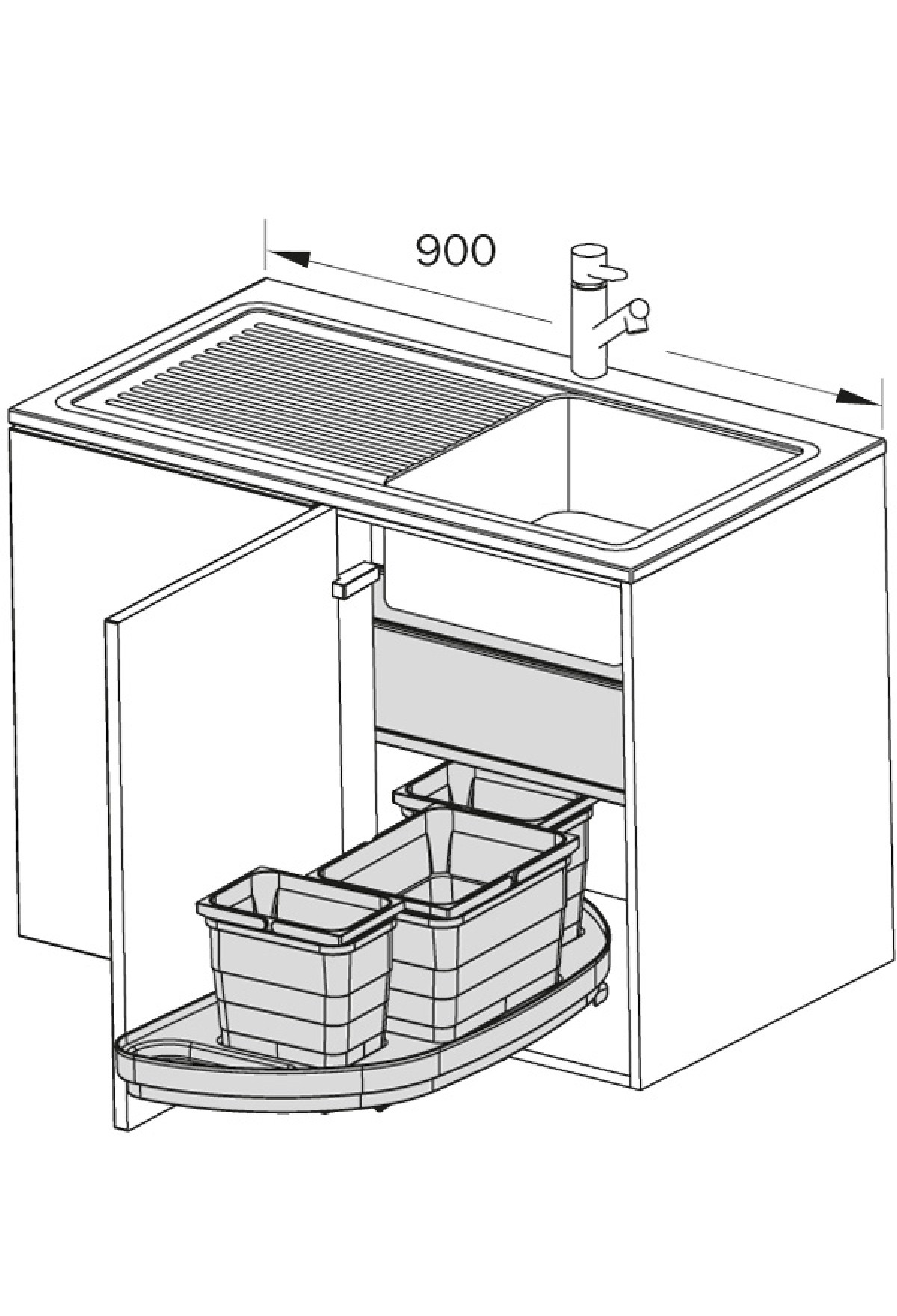 Карусель с комплектом ведер в угловой шкаф с распашной дверью. Позволяет эффективно использовать труднодоступное пространство в проходном шкафу под мойкой. Карусельный механизм обеспечивает комфортный доступ к содержимому. Многофункциональная система может применяться для сбора мусора или хранения кухонных аксессуаров. Карусель выдвигается синхронно с открыванием фасада. Просто содержать в чистоте - полка легко снимается с механизма.