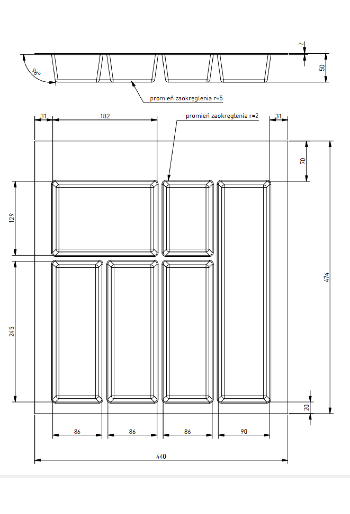 Лоток специально подбирается под размеры конкретного ящика стола или кухонного гарнитура. При необходимости можно самостоятельно уменьшить размеры лотка, подрезав его по месту.