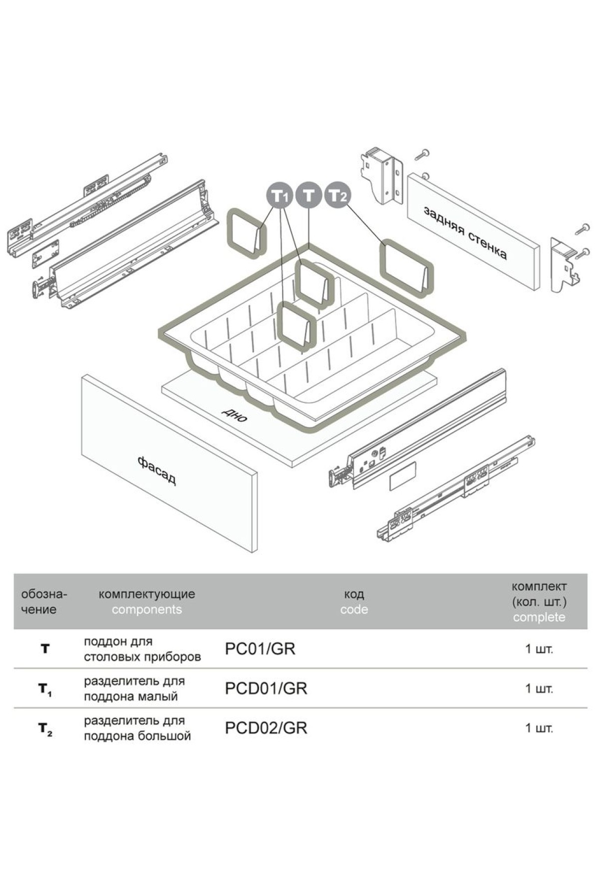Технические характеристики Лоток для столовых приборов 600мм пластик серый PC01/GR/530x480 Boyard