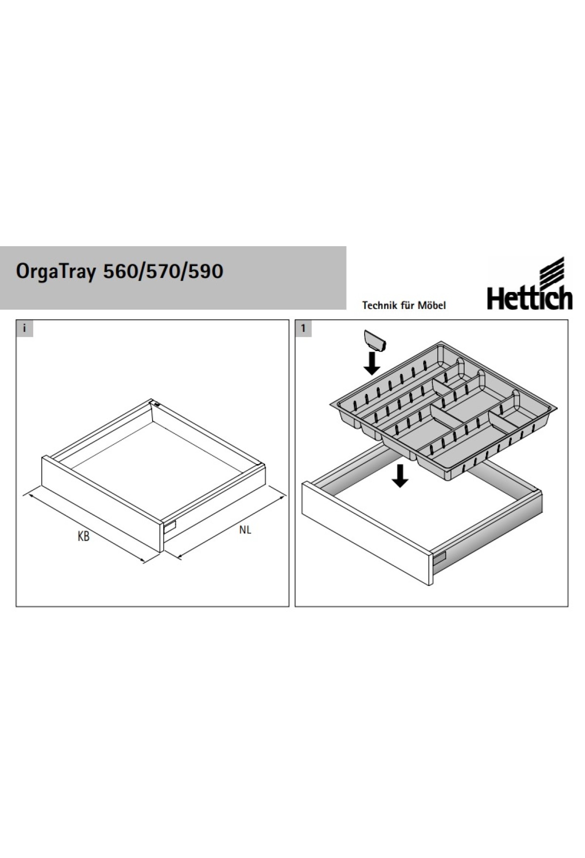 OrgaTray 590: Пластиковый лоток для столовых приборов, предназначенный специально для установки в выдвижные ящики Hettich Innotech Atira глубиной 470 мм.