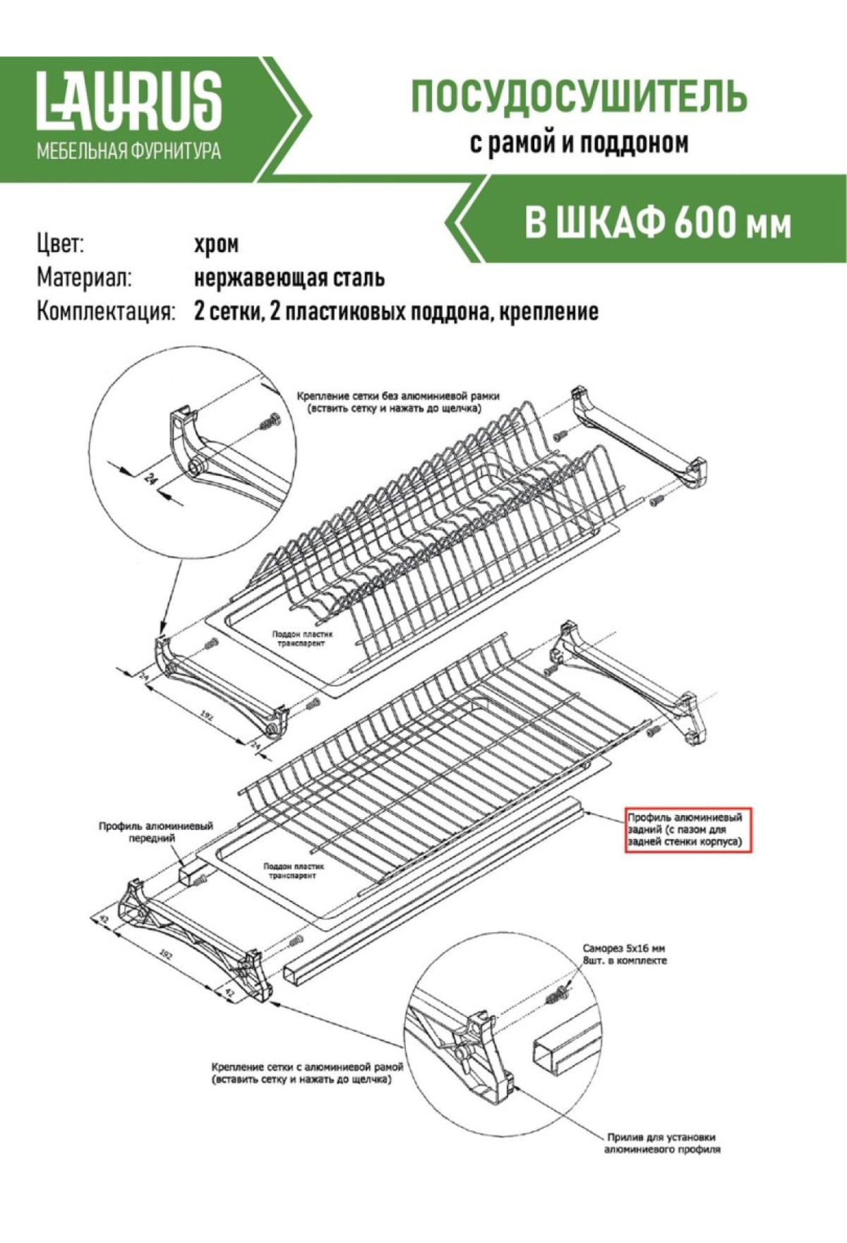- Посудосушитель 600мм хром с рамой и поддоном (Вариант 3)