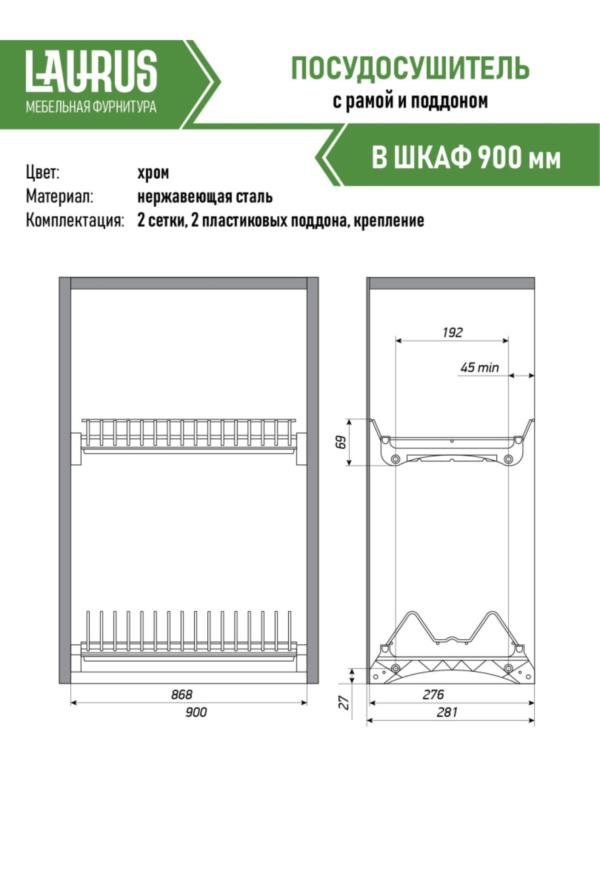 | Ширина корпуса/база для лотка (Посудосушители, лотки) | 900 мм |
