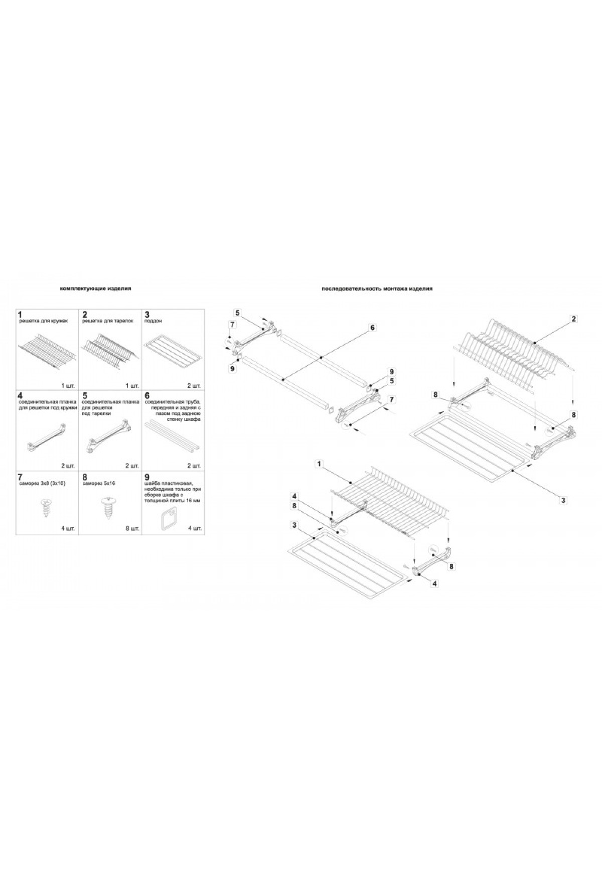 Комплект сушки включает 2 яруса для хранения посуды с надёжным гальваническим покрытием с эффектом хромирования, 2 съёмных поддона из качественного бесцветного пластика, 4 пластиковых серых держателя нижнего и верхнего уровней, переднюю и заднюю алюминиевые трубки, саморезы для монтажа сушки и крепления трубки.